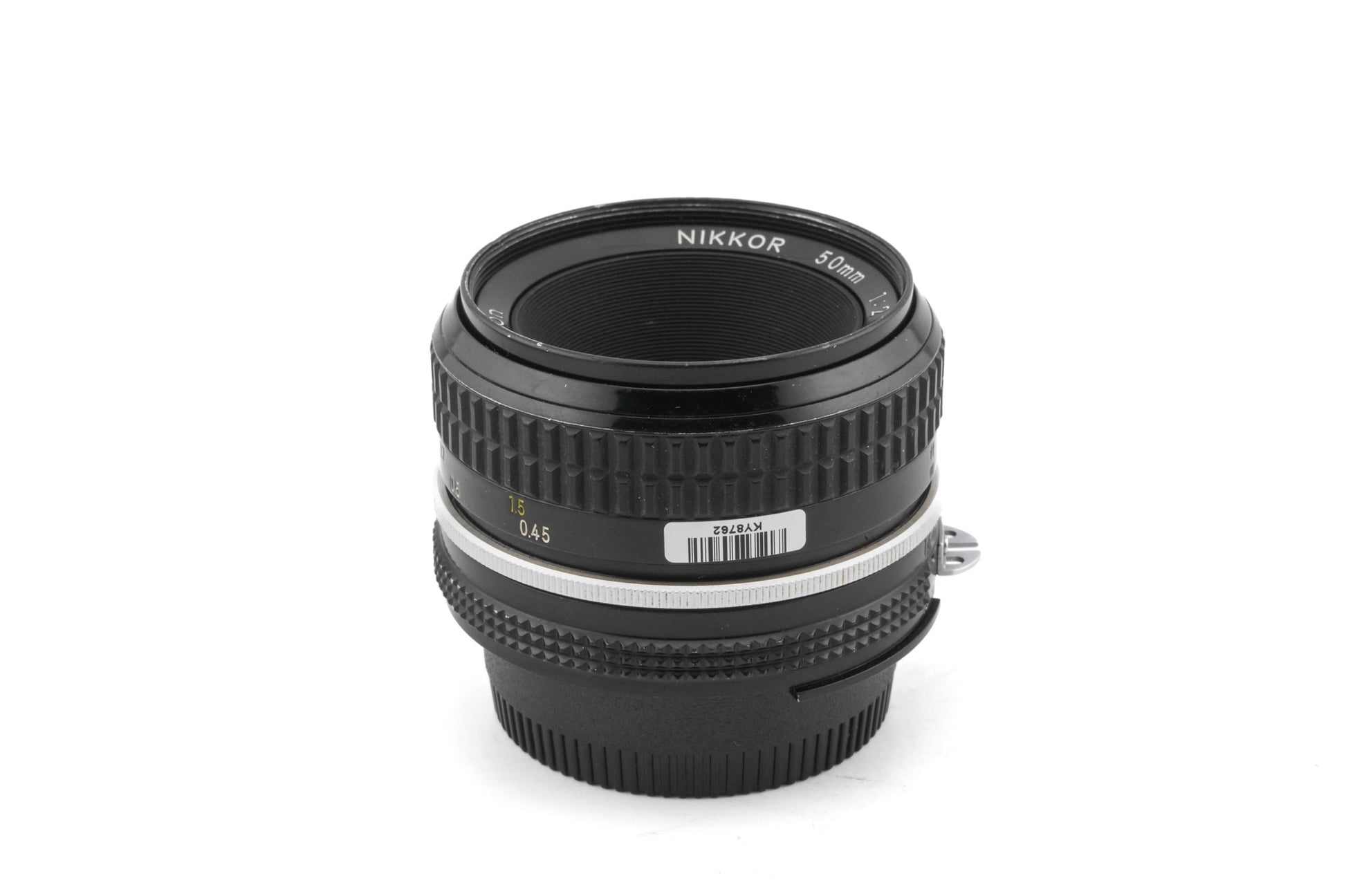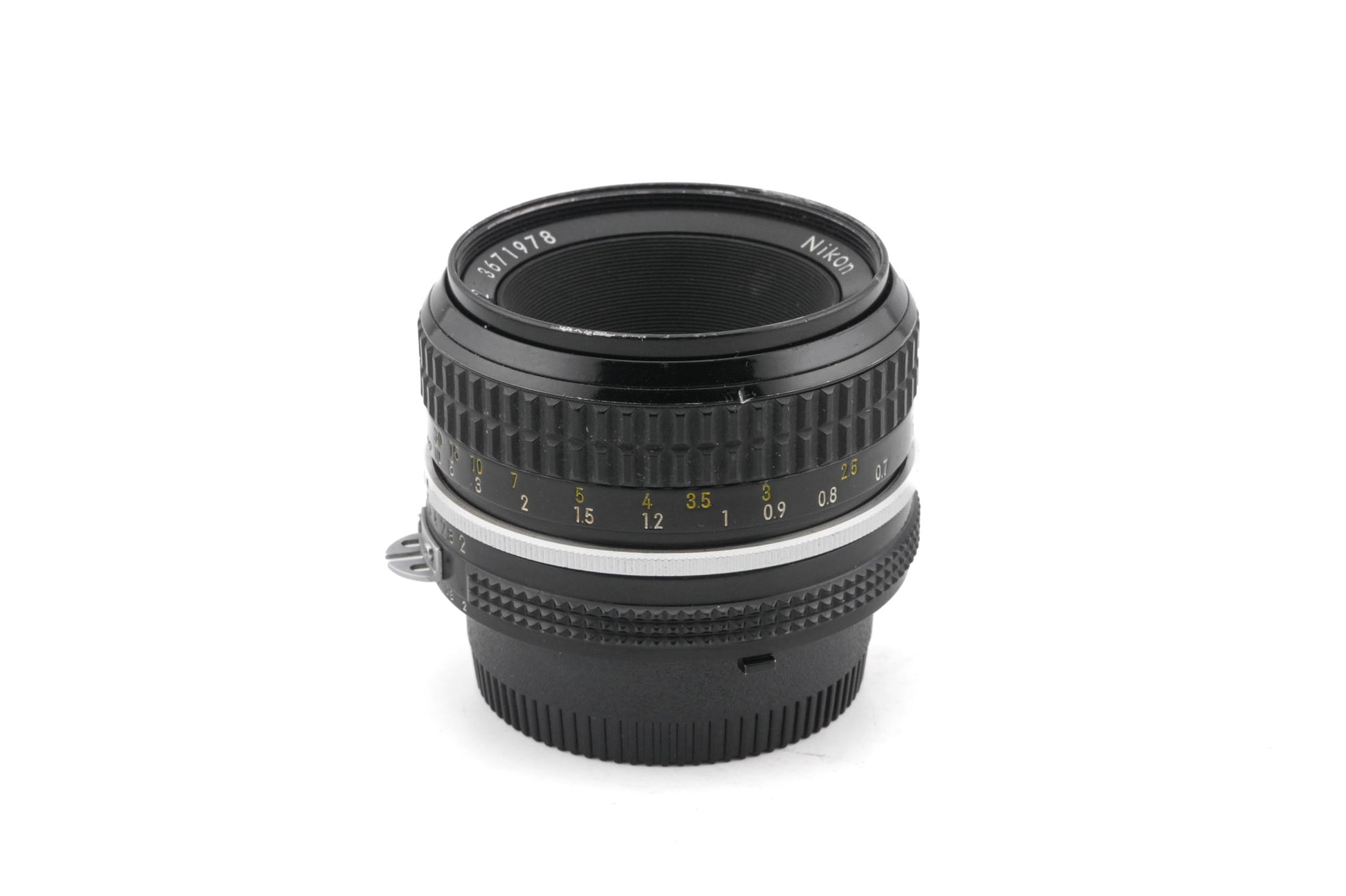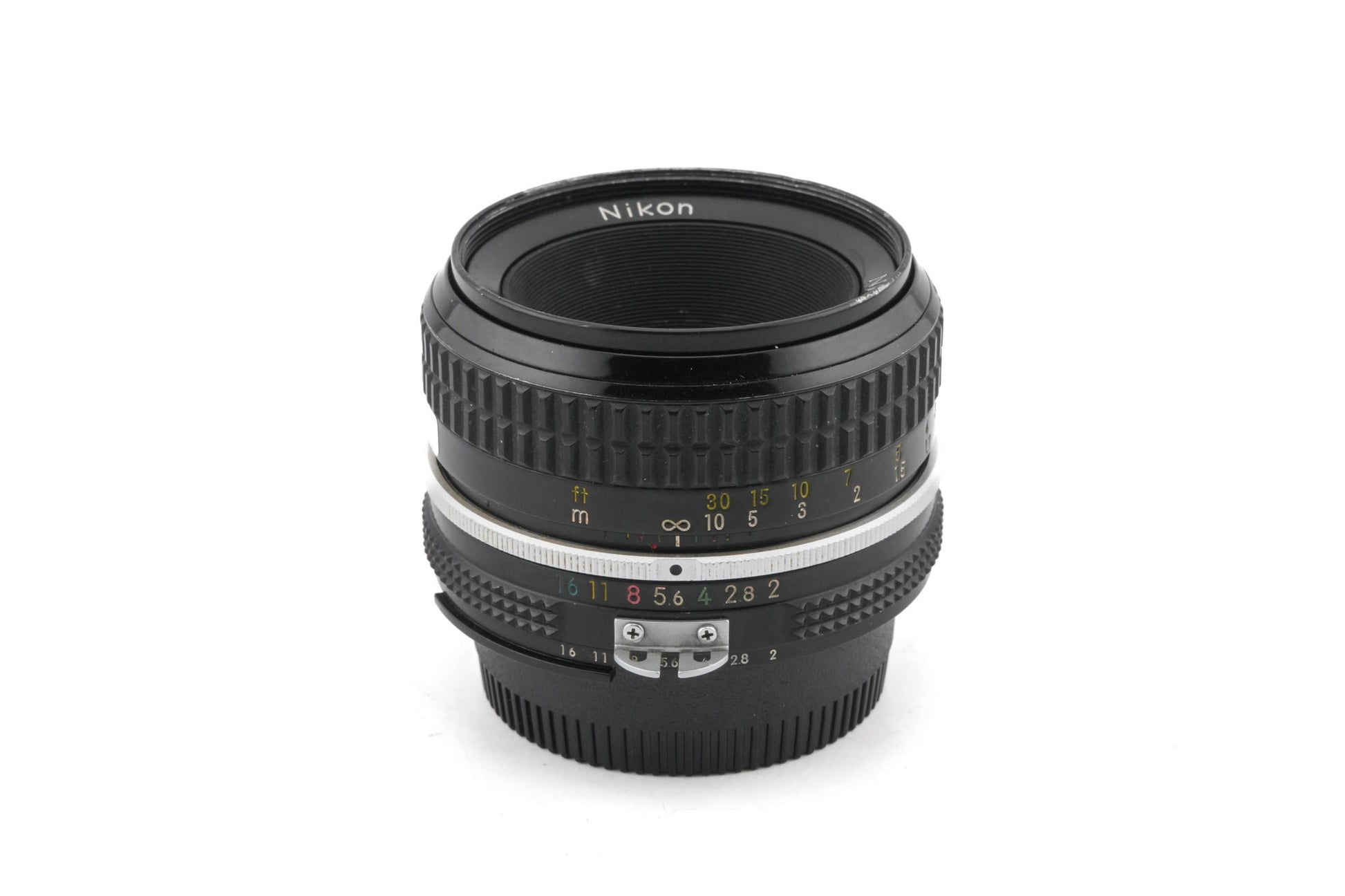 Manual focus normal lens made for F-mount SLRs by Nikon. This lens uses the same optical formula as the earlier 5cm f2 Nikkor-H introduced in 1964, although later versions of this lens added multi-coatings. It has the bunny ear metering prongs and AI ridge, but no AI-S indent, so it will meter properly on all manual Nikon cameras, but can't be used with the advanced program modes of later models. Metal and plastic body available in black.