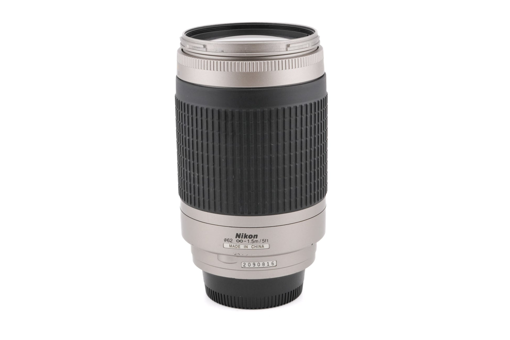 Autofocus telephoto zoom lens made for F-mount 35mm SLR cameras introduced by Nikon starting in 2000. It's part of the G-series, meaning it has no aperture ring and requires a body that can control the aperture electronically. Autofocus requires a body with a screw drive AF motor. Plastic body available in black, silver, and champagne.
