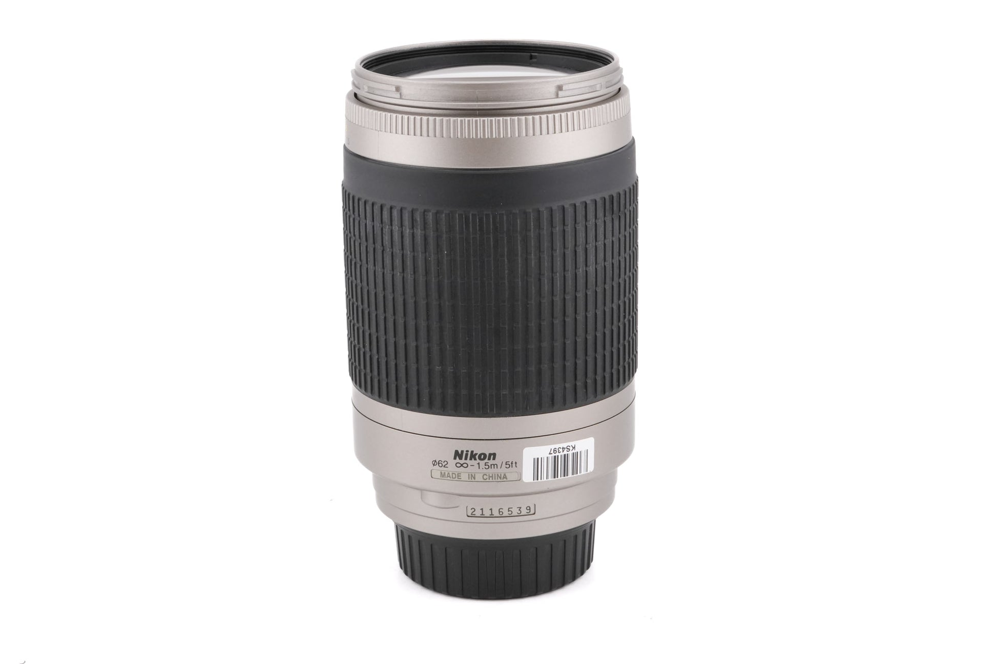 Autofocus telephoto zoom lens made for F-mount 35mm SLR cameras introduced by Nikon starting in 2000. It's part of the G-series, meaning it has no aperture ring and requires a body that can control the aperture electronically. Autofocus requires a body with a screw drive AF motor. Plastic body available in black, silver, and champagne.