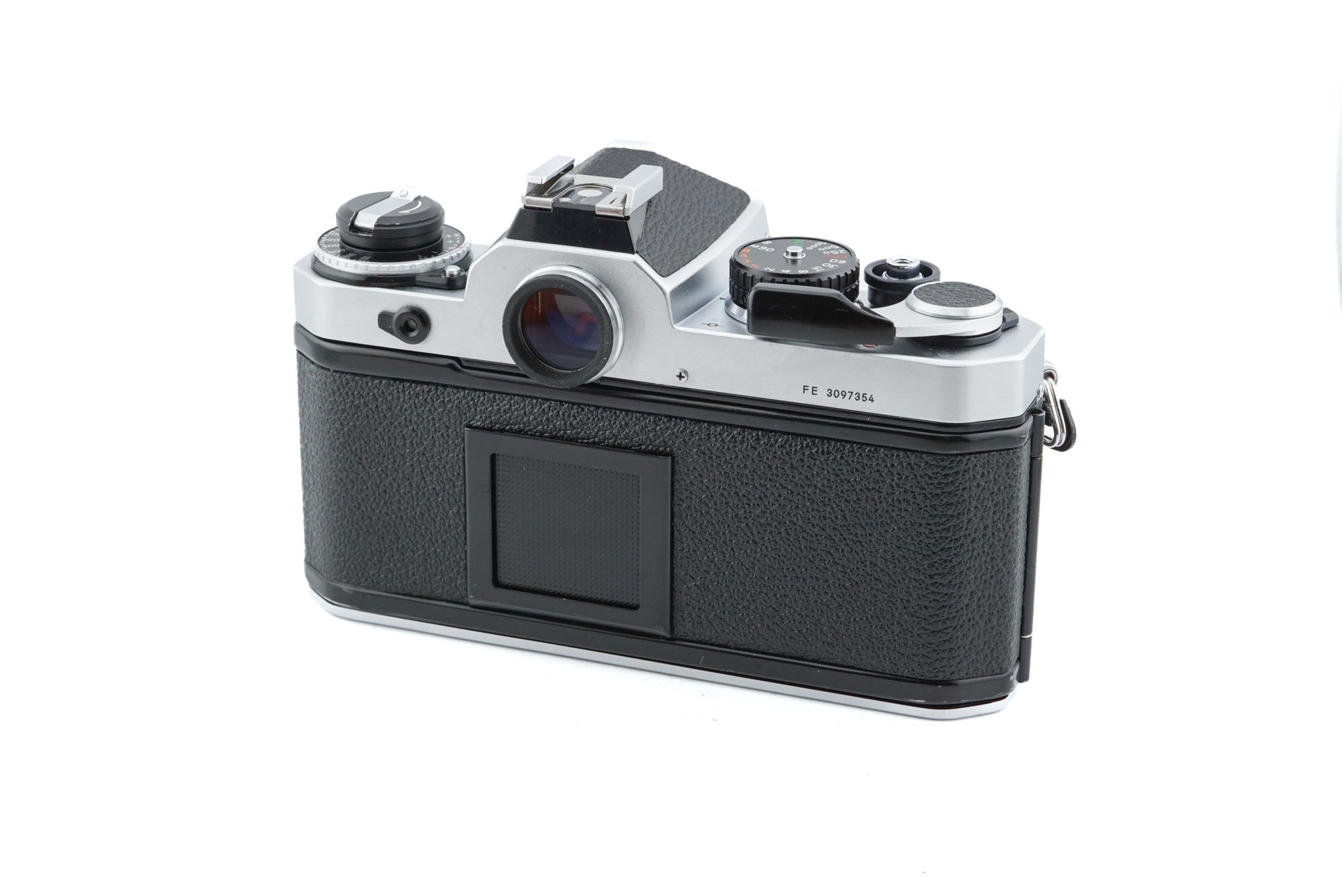 Manual focus F-mount 35mm SLR released by Nikon in 1978. It was a replacement for the Nikon EL2 and EL-W. The FE has an electronically-controlled focal plane shutter and is capable of aperture priority auto exposure as well as manual exposure. It will only meter properly with lenses that have the AI ridge and an aperture ring. Metal body available in black & silver.
