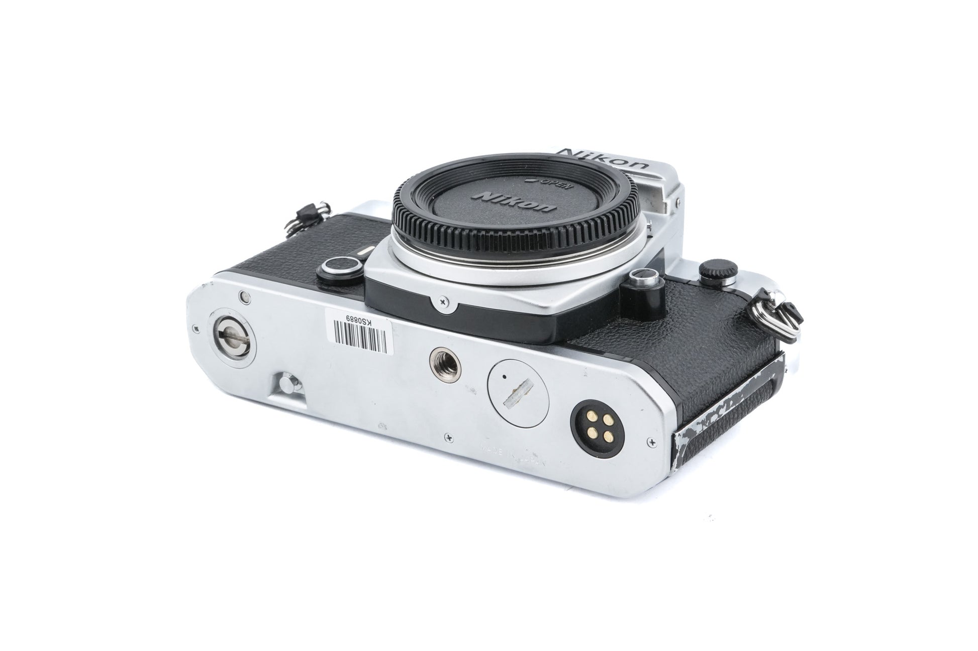 Manual focus F-mount 35mm SLR released by Nikon in 1978. It was a replacement for the Nikon EL2 and EL-W. The FE has an electronically-controlled focal plane shutter and is capable of aperture priority auto exposure as well as manual exposure. It will only meter properly with lenses that have the AI ridge and an aperture ring. Metal body available in black & silver.