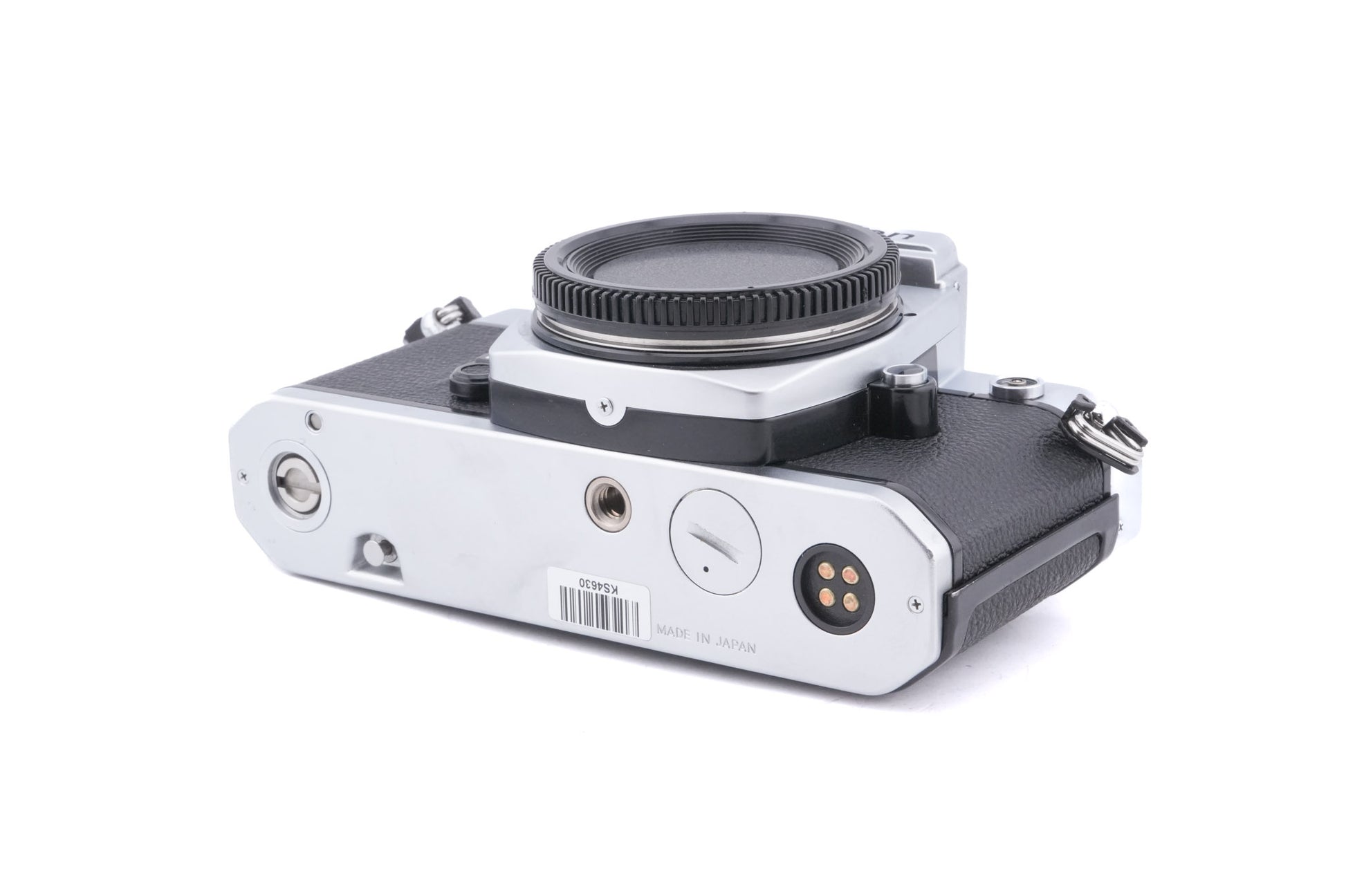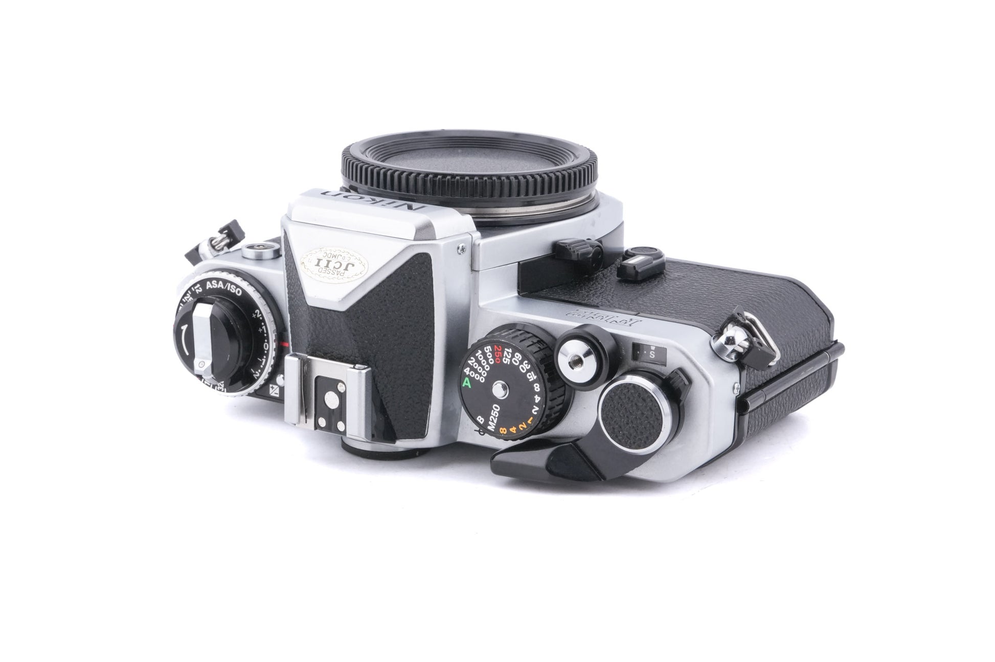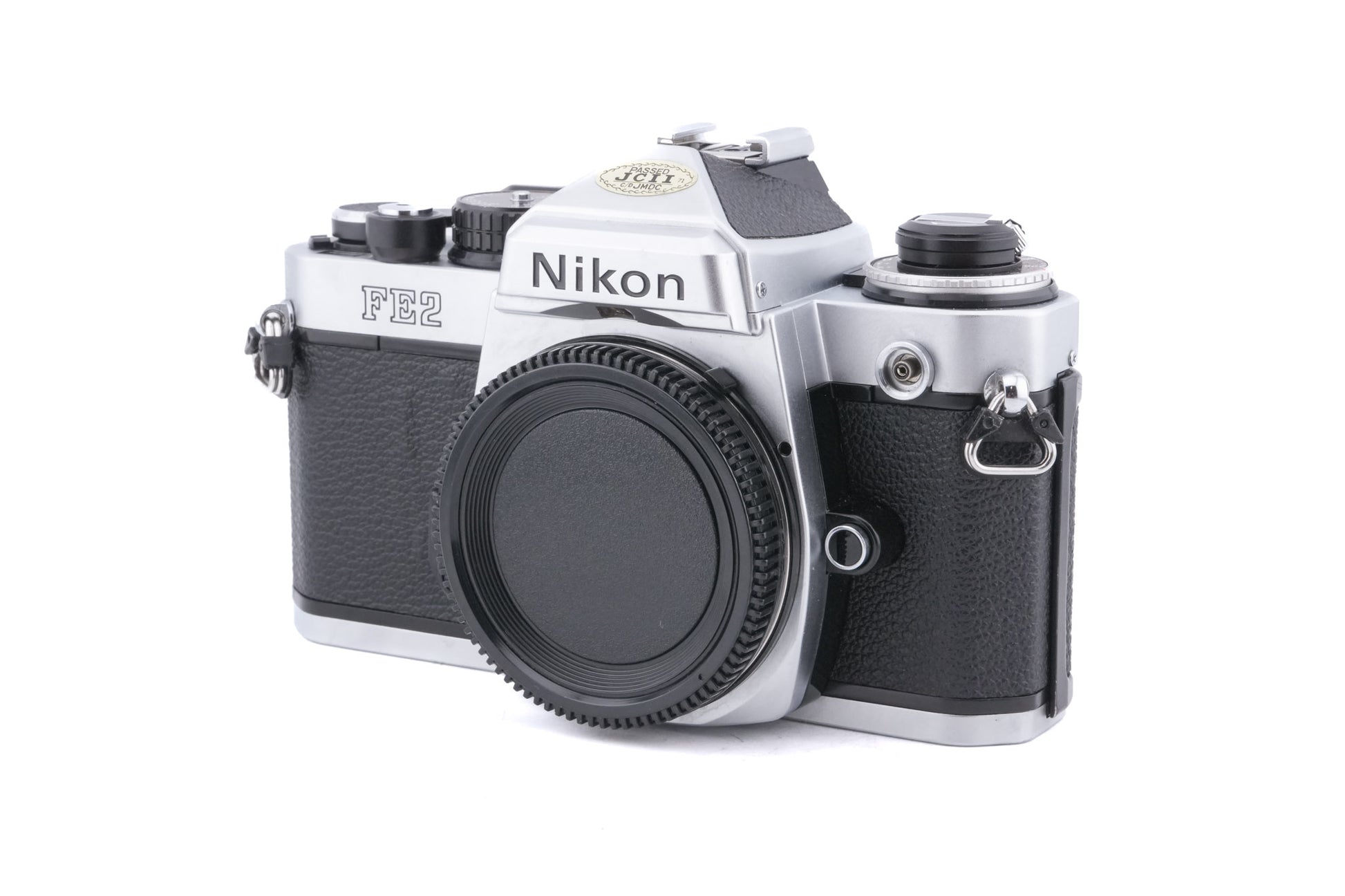Manual focus F-mount 35mm SLR released by Nikon in 1983. The FE2 improved upon the FE by increasing the top shutter speed (1/4000s) and adding compatibility with certain TTL flashes. Metal body available in black and silver.