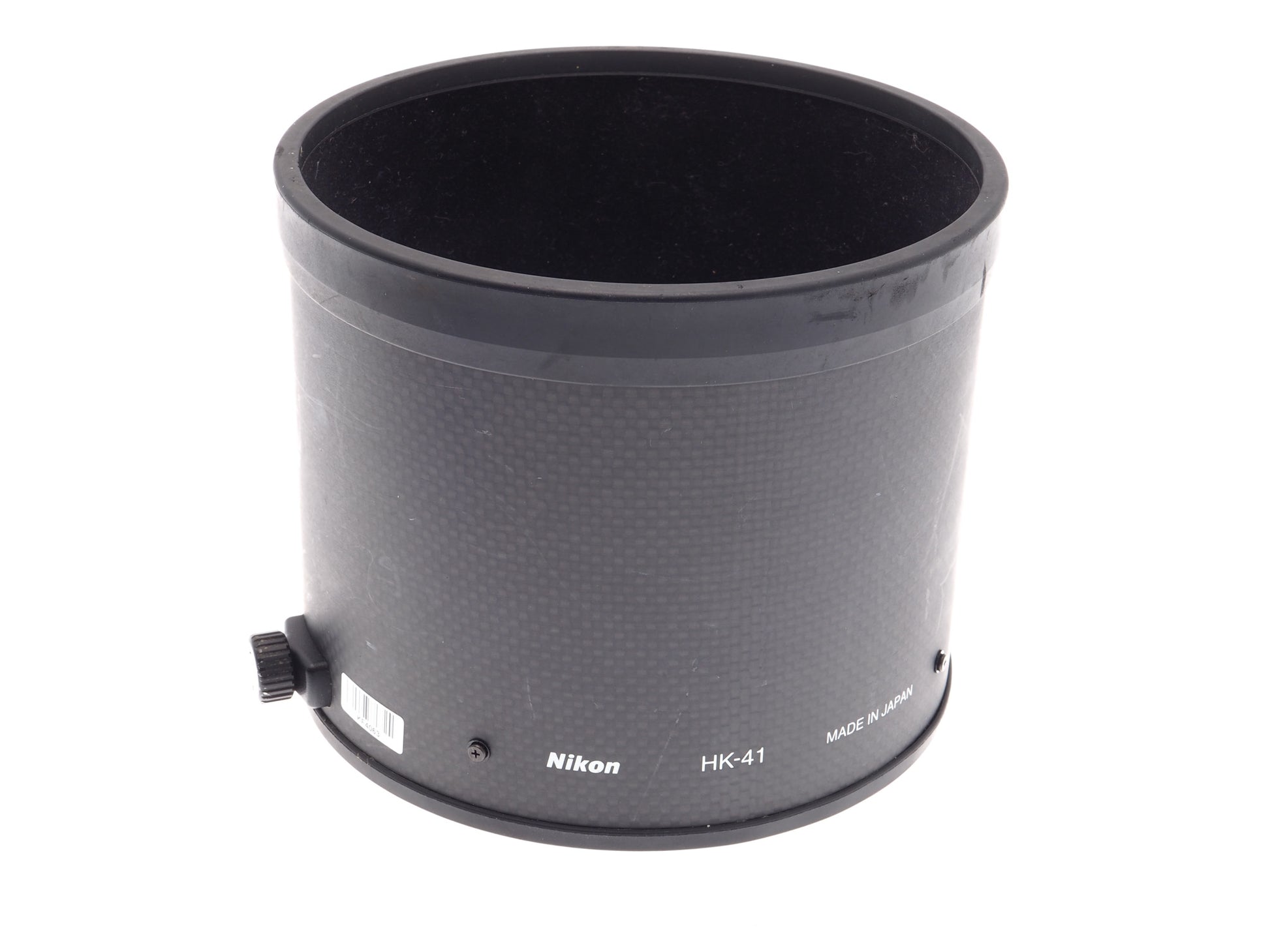 Lens hood made by Nikon for Nikon 180-400mm f4 E TC1.4 FL ED VR AF-S Nikkor and Nikon 120-300mm f2.8 E FL ED SR VR AF-S Nikkor lens. This hood features a slip-on design and is held in place by an integrated thumbscrew. Used to protect the front element and from flare. Carbon fiber body.