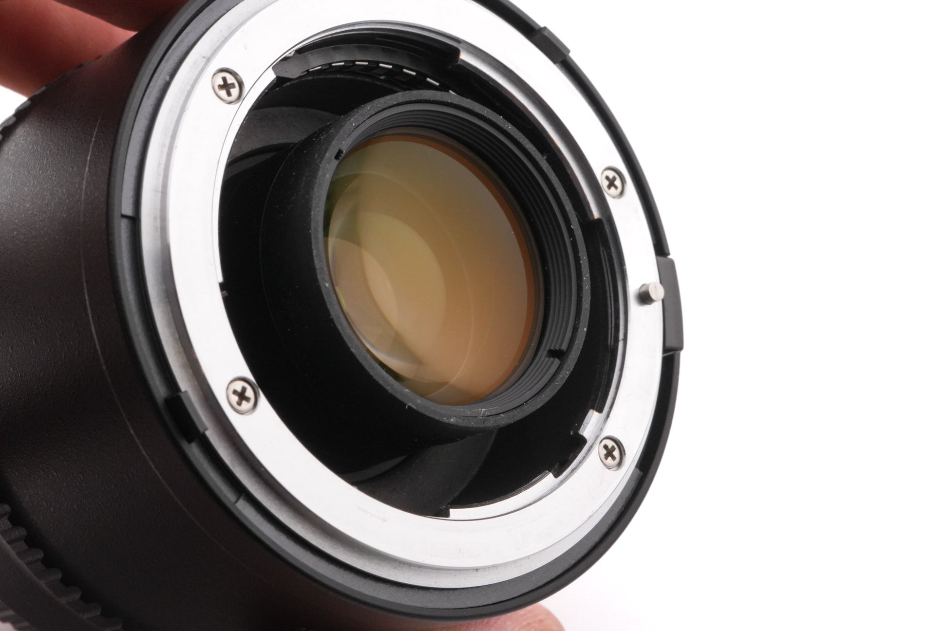 Autofocus teleconverter made for F-mount SLR cameras by Nikon. It doubles the focal length of your lens at the cost of some (2 EV) light transmission. This teleconverter does not have a pass-through for screw-drive autofocus and the front element protrudes into the lens a bit, so be sure to check compatibility before use. Metal and plastic body available in black.