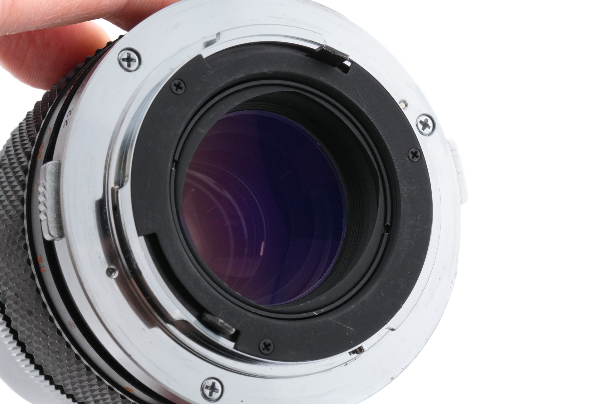 Manual focus telephoto lens made for OM-mount 35mm SLR cameras introduced by Olympus. It has a built-in lens hood. Metal body in black.