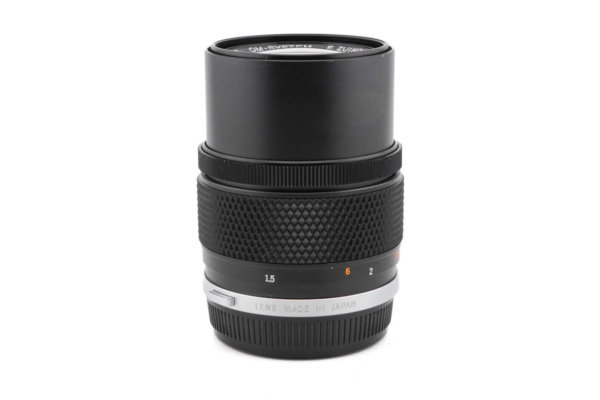 Manual focus telephoto lens made for OM-mount 35mm SLR cameras introduced by Olympus. It has a built-in lens hood. Metal body in black.