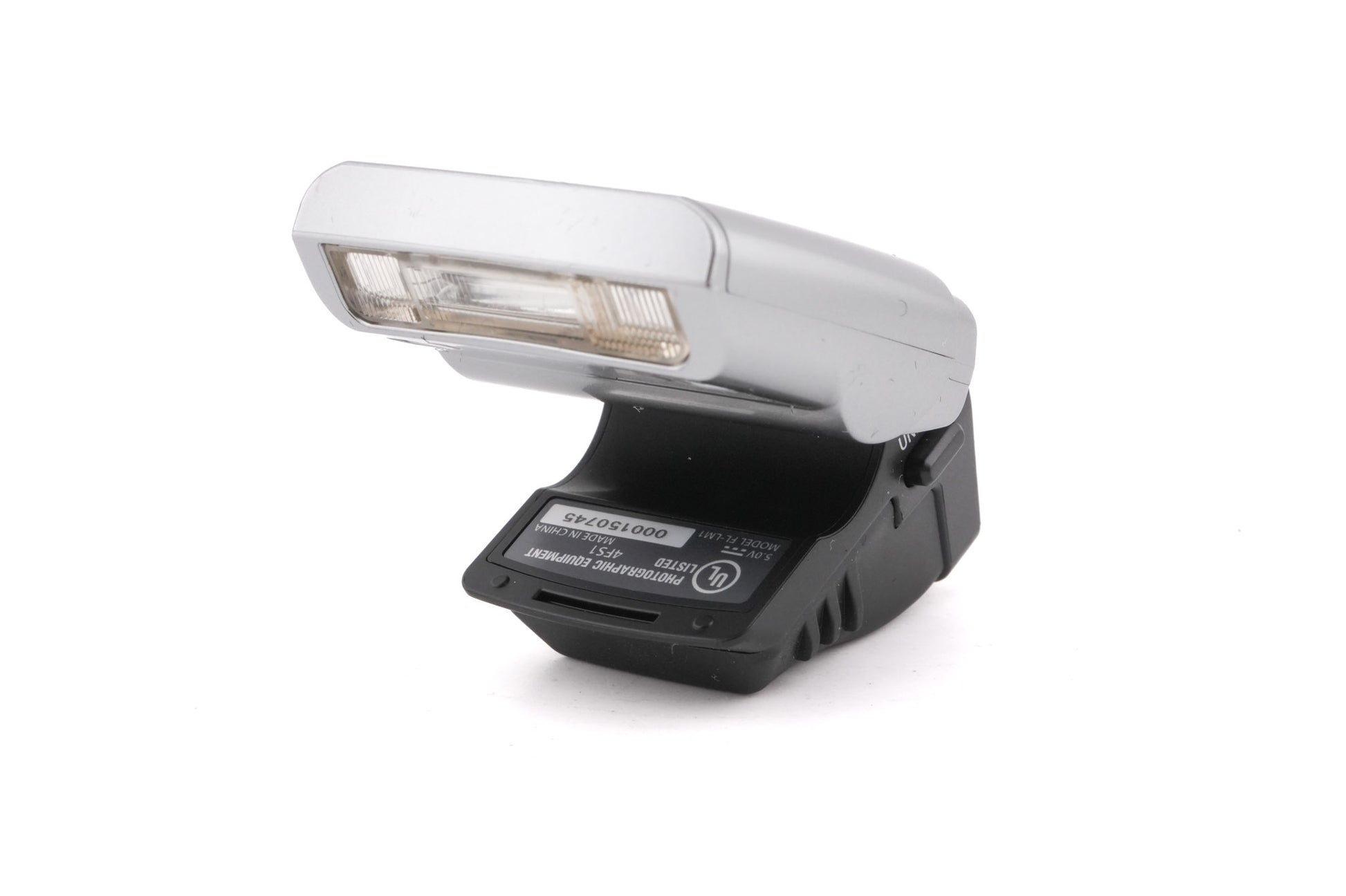 Small-sized flash unit made by Olympus. Plastic body available in silver.