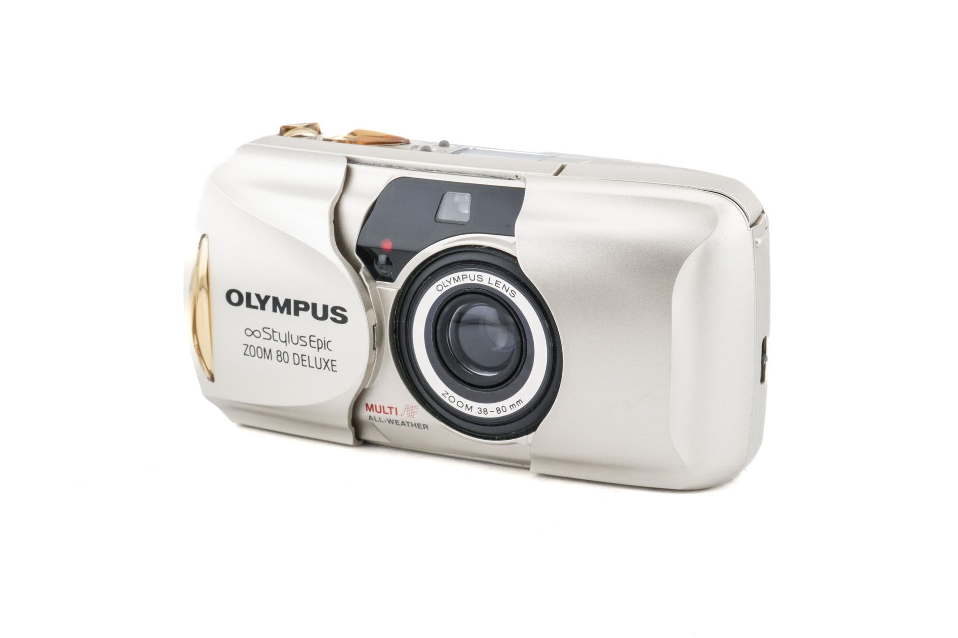 Autofocus 35mm point-and-shoot camera released by Olympus in 1999. The Zoom 80 has the shortest zoom range of any Stylus Epic Zoom model but features the same weather-sealing and basic features as other models. It was also sold as the Mju-II Zoom 80 (EU). Models with date backs have "Deluxe" added to the name. Plastic body available in black/champagne