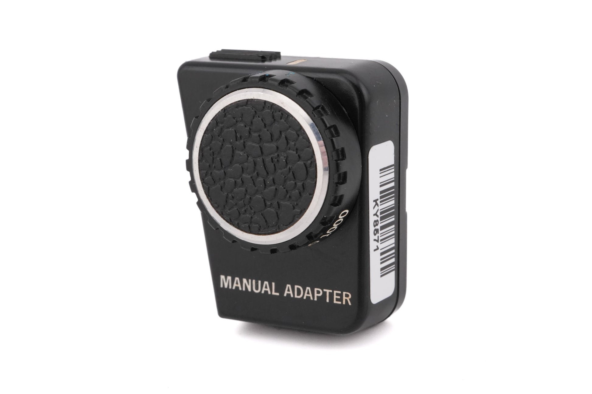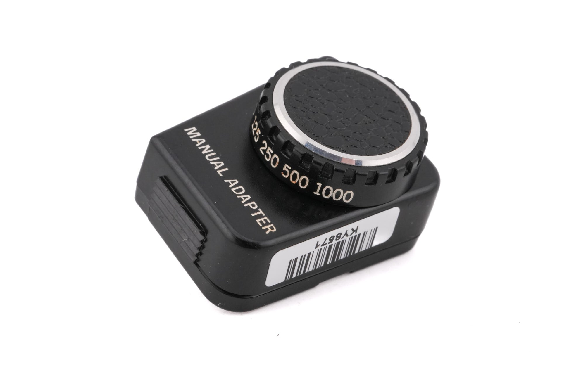 Manual adapter made by Olympus. It is used for manually selecting shutter speeds on the otherwise aperture priority Olympus OM10. The adapter plugs into the front of the camera, underneath the rewind knob. Just set the OM10 to "Manual" mode! Plastic body available in black.