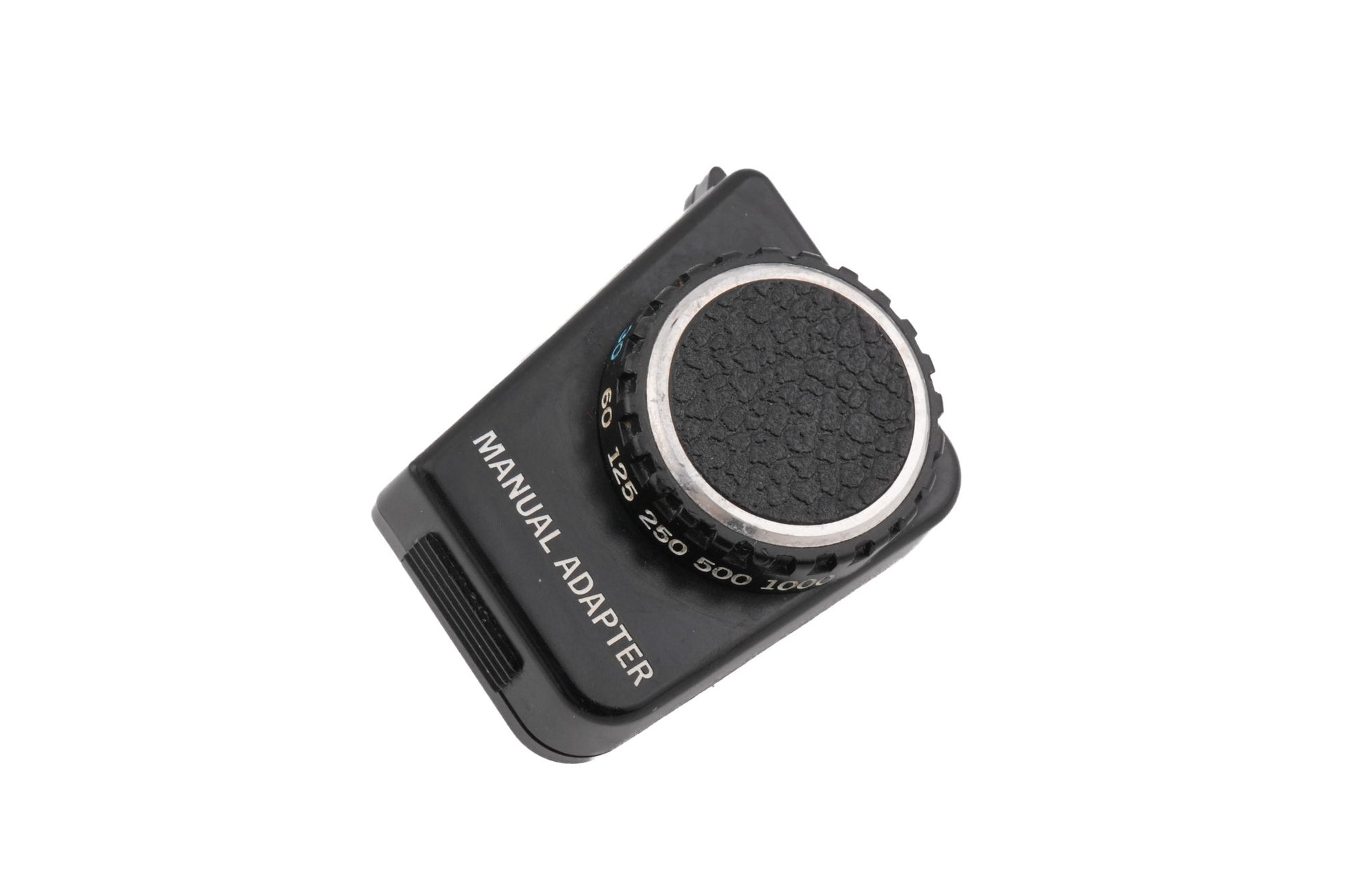 Manual adapter made by Olympus. It is used for manually selecting shutter speeds on the otherwise aperture priority Olympus OM10. The adapter plugs into the front of the camera, underneath the rewind knob. Just set the OM10 to "Manual" mode! Plastic body available in black.