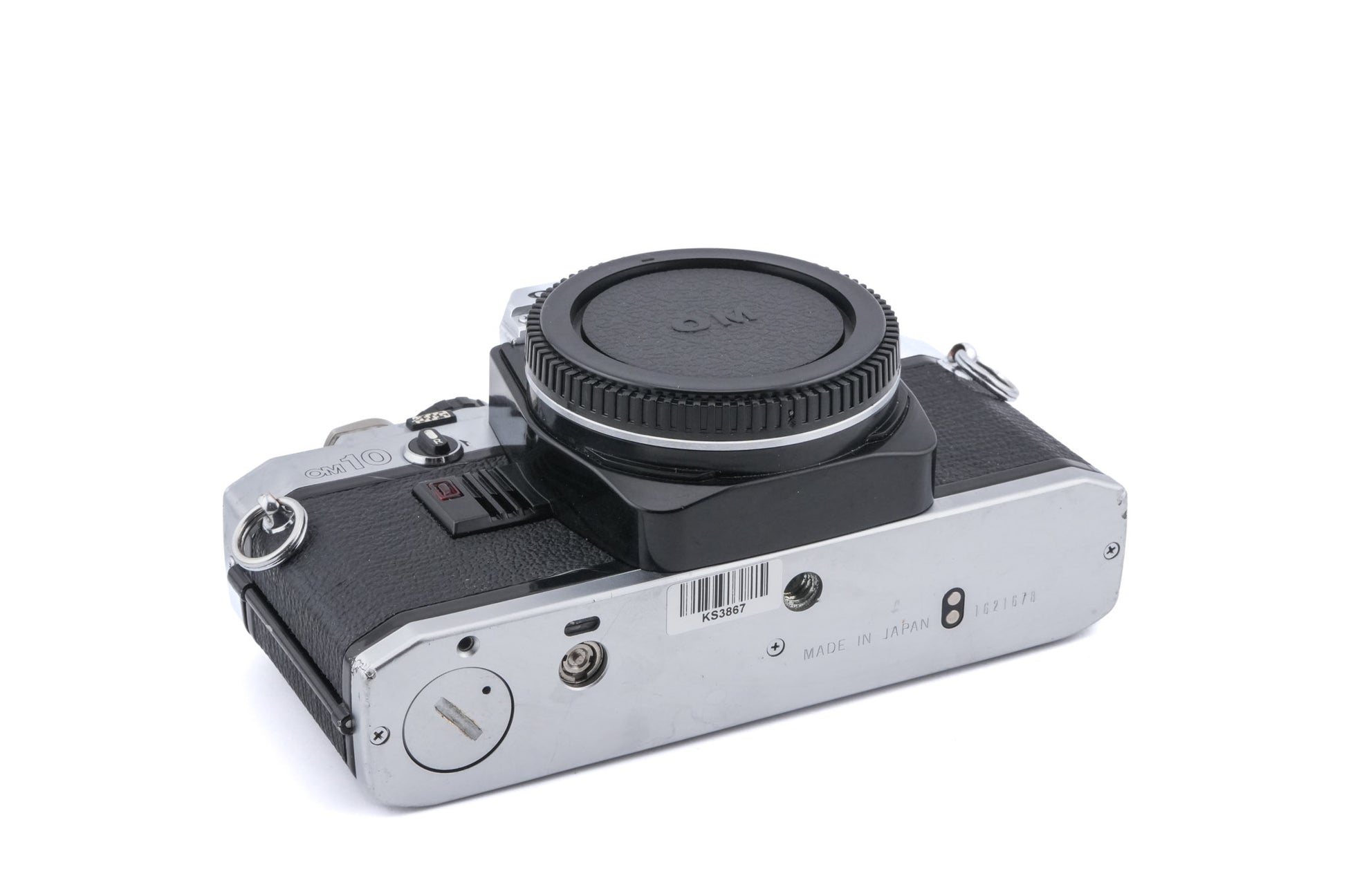 Manual focus OM-mount 35mm SLR released by Olympus in 1979. This was the first of Olympus' 2-digit OM series aimed at consumers instead of professionals. Fires only in aperture priority mode unless the optional manual adapter is attached. It has a self-timer, a hot shoe, and +/- 2 exposure compensation. Metal body available in silver.