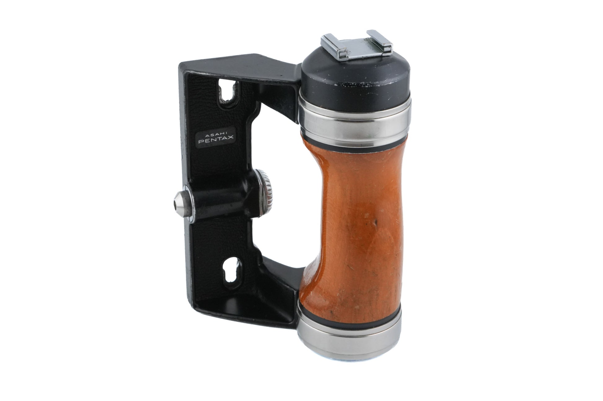 Wooden grip made for the 6x7, 67, and 67II cameras introduced by Pentax. At least two variations exist, one with a cold shoe and a later one with a hot shoe that connects to the camera body. Wooden and metal body available in black.