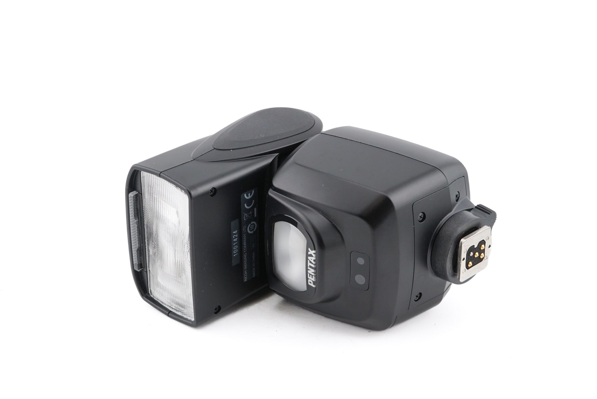 Flash made for K-mount DSLR cameras by Pentax. Plastic body available in black.