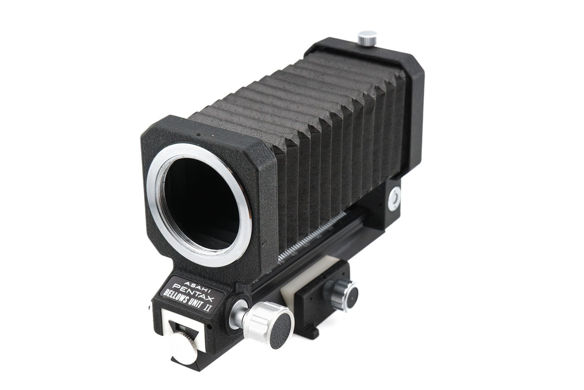 Macro bellows for M42-mount SLR cameras and lenses made by Pentax. The rail is marked with 1 millimeter increments up to 135mm. Metal construction available in black.
