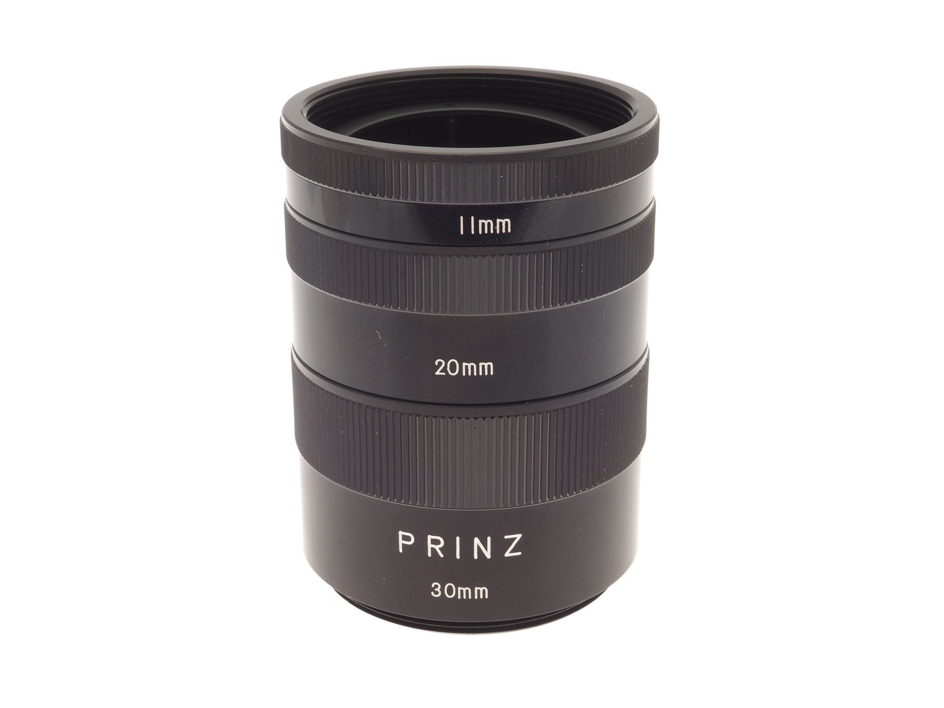 Extension tube set made for M42 35mm SLRs by Prinz. Has automatic aperture pass-through. Set of one 30mm, one 20mm, and one 11mm tubes.