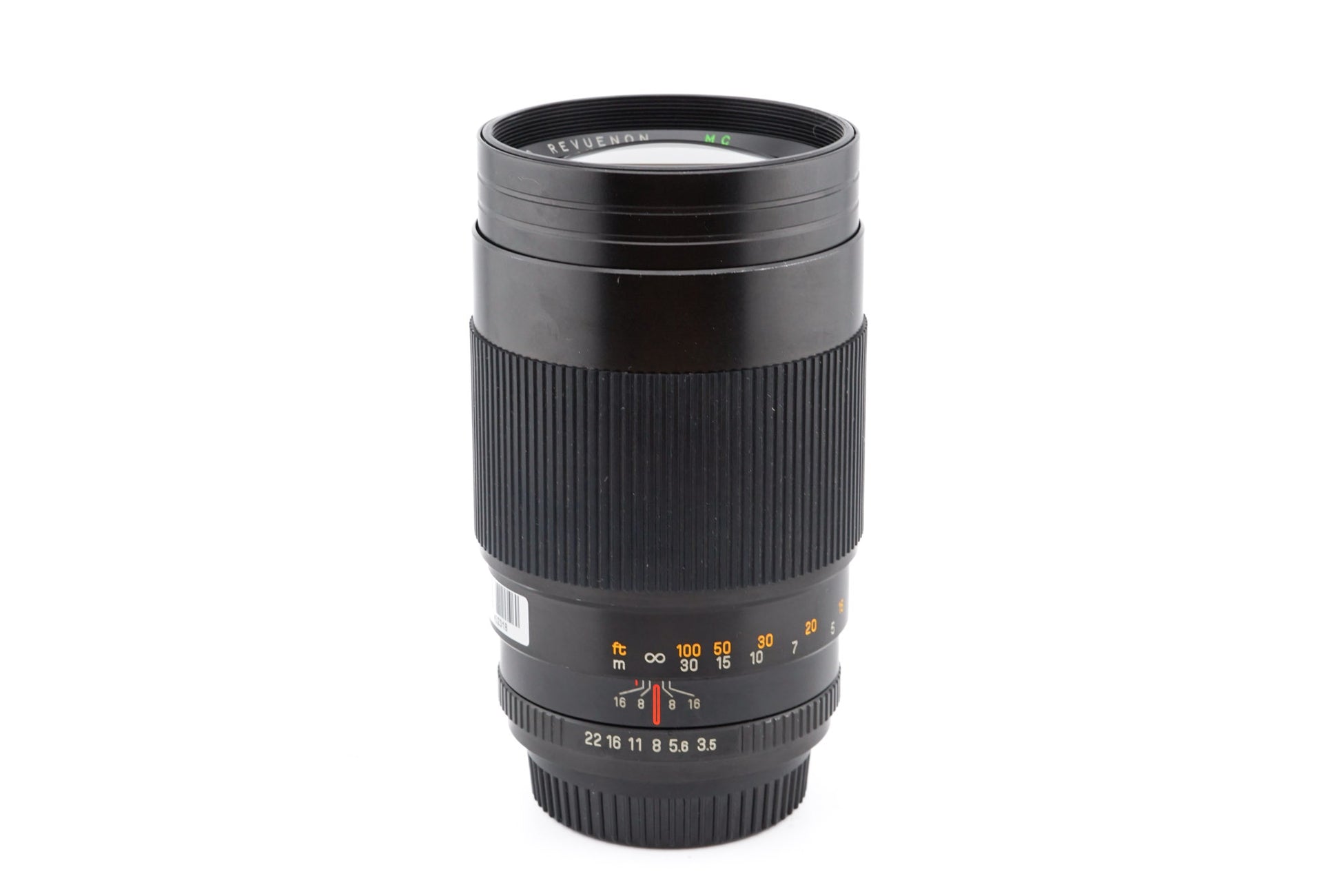Manual focus telephoto prime lens made for Pentax K mount SLR cameras by Revuenon. Has a built-in lens hood. Metal body available in black.
