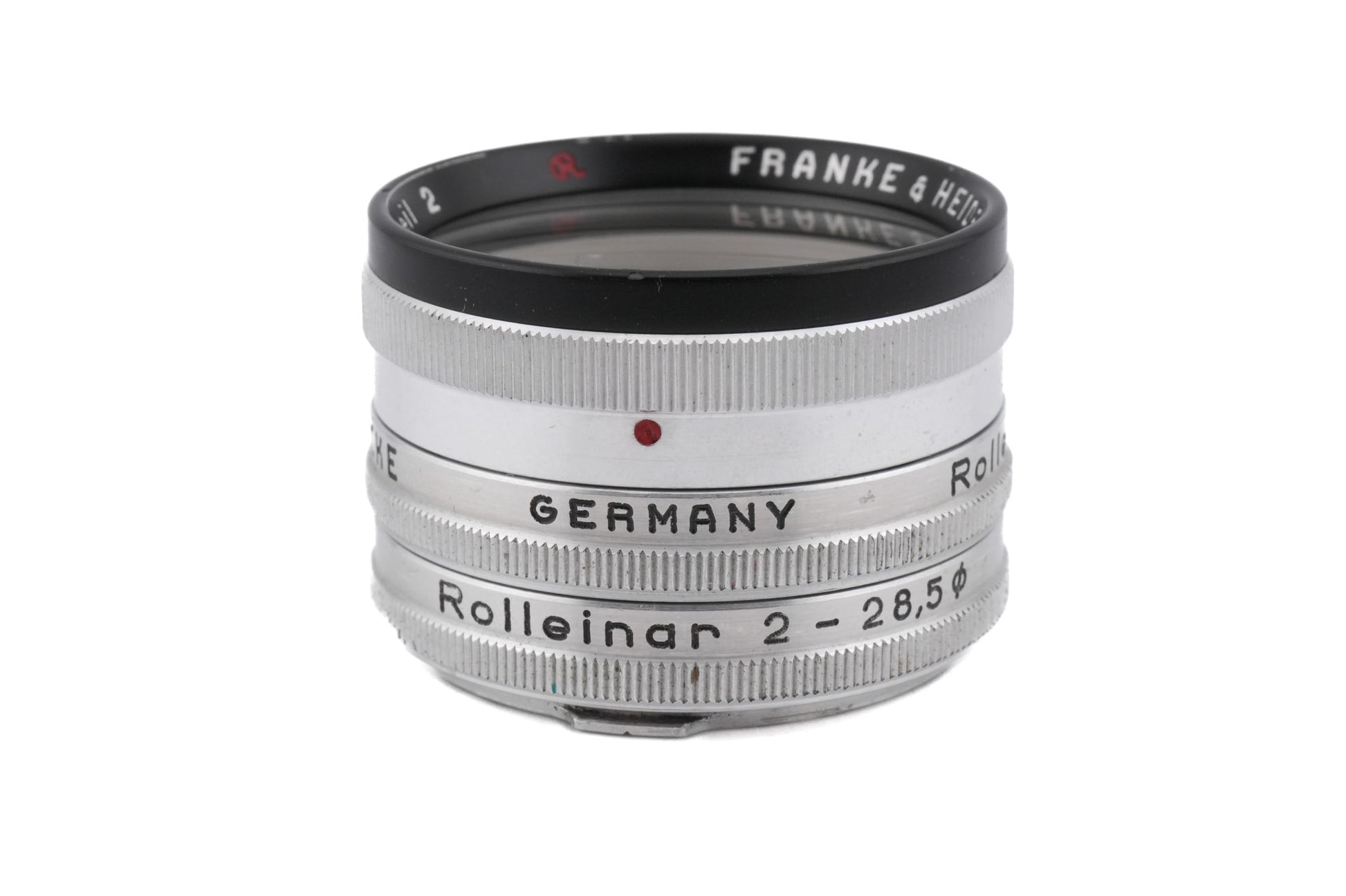 Close-up filter set made for TLRs by Rollei. The older version consists of three pieces and the newer version only has two. Both work identically and allow for focusing up to 31cm. Metal body available in silver.