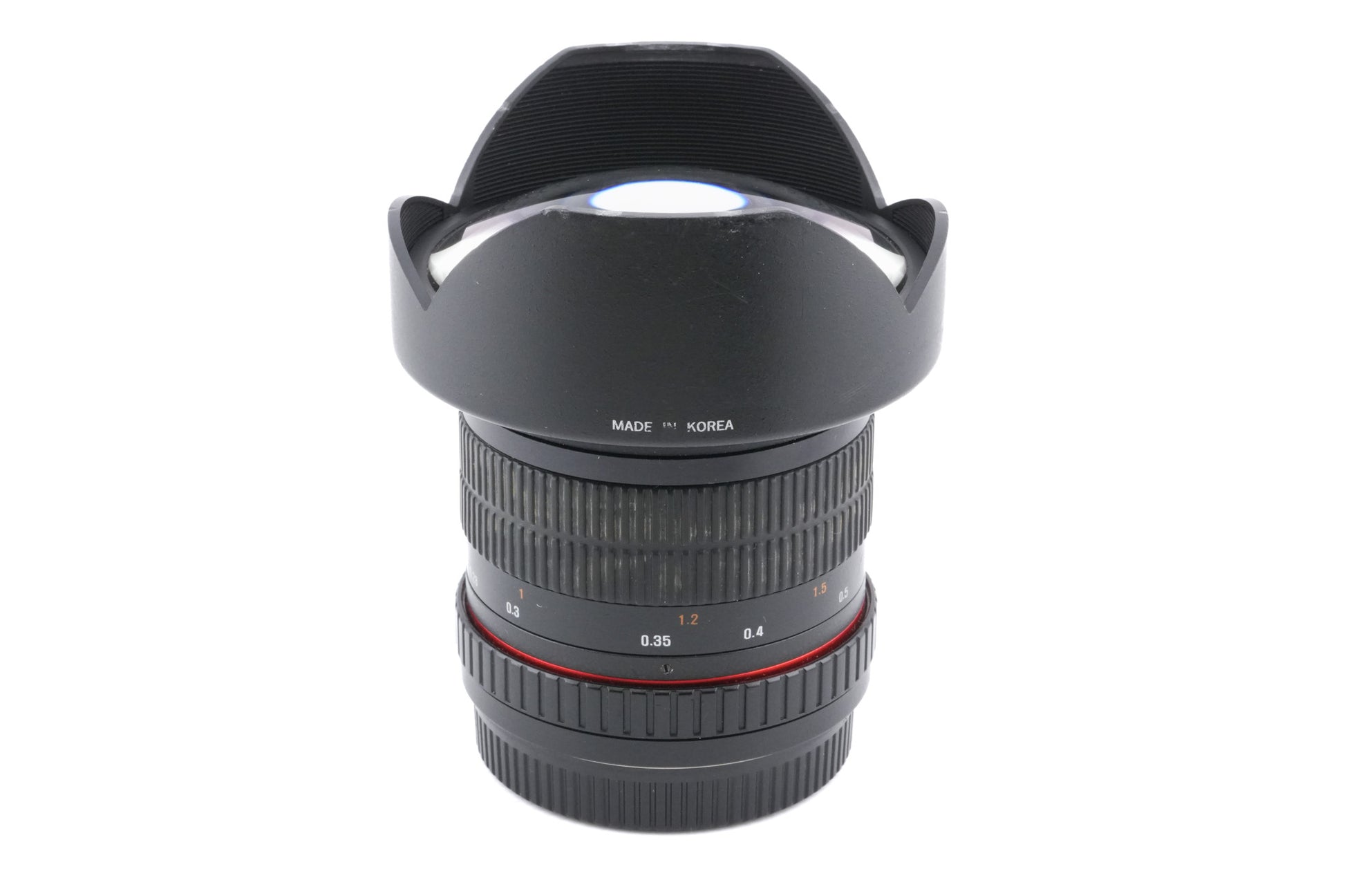 Manual focus wide-angle lens made for EF-mount (D)SLR cameras by Samyang. It has no electronics inside, so focus and aperture are controlled manually. Plastic body available in black.