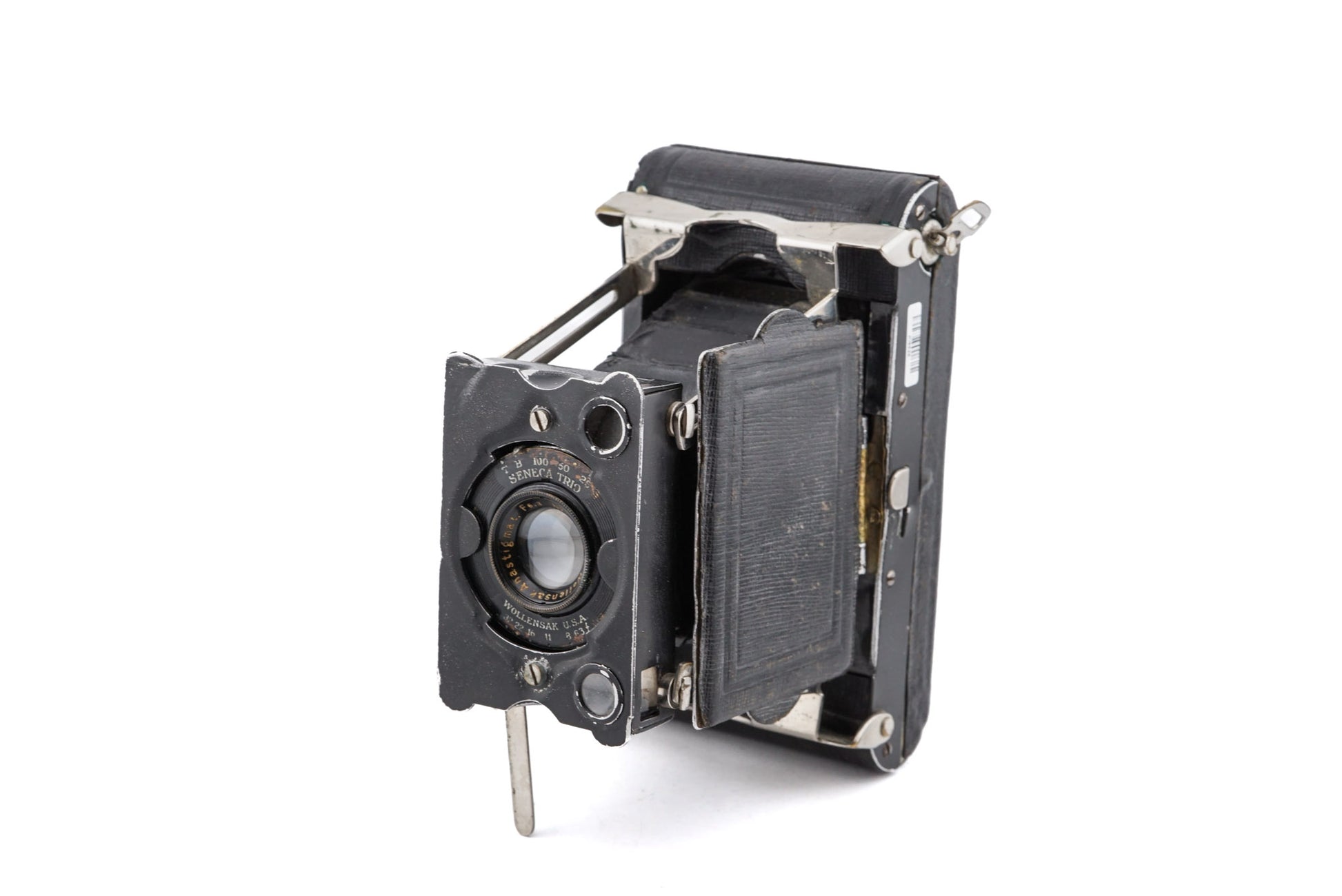 Folding 127-roll film pocket camera made by Seneca between 1916 and 1925. The camera was possibly manufactured with different shutter and lens combinations. Metal and wood body available in black.