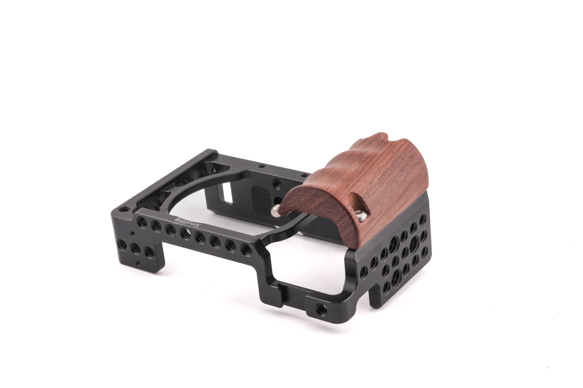 Full-body cage for Sony A6000/A6300 made by Smallrig. Metal construction available in black with a brown wooden handle.