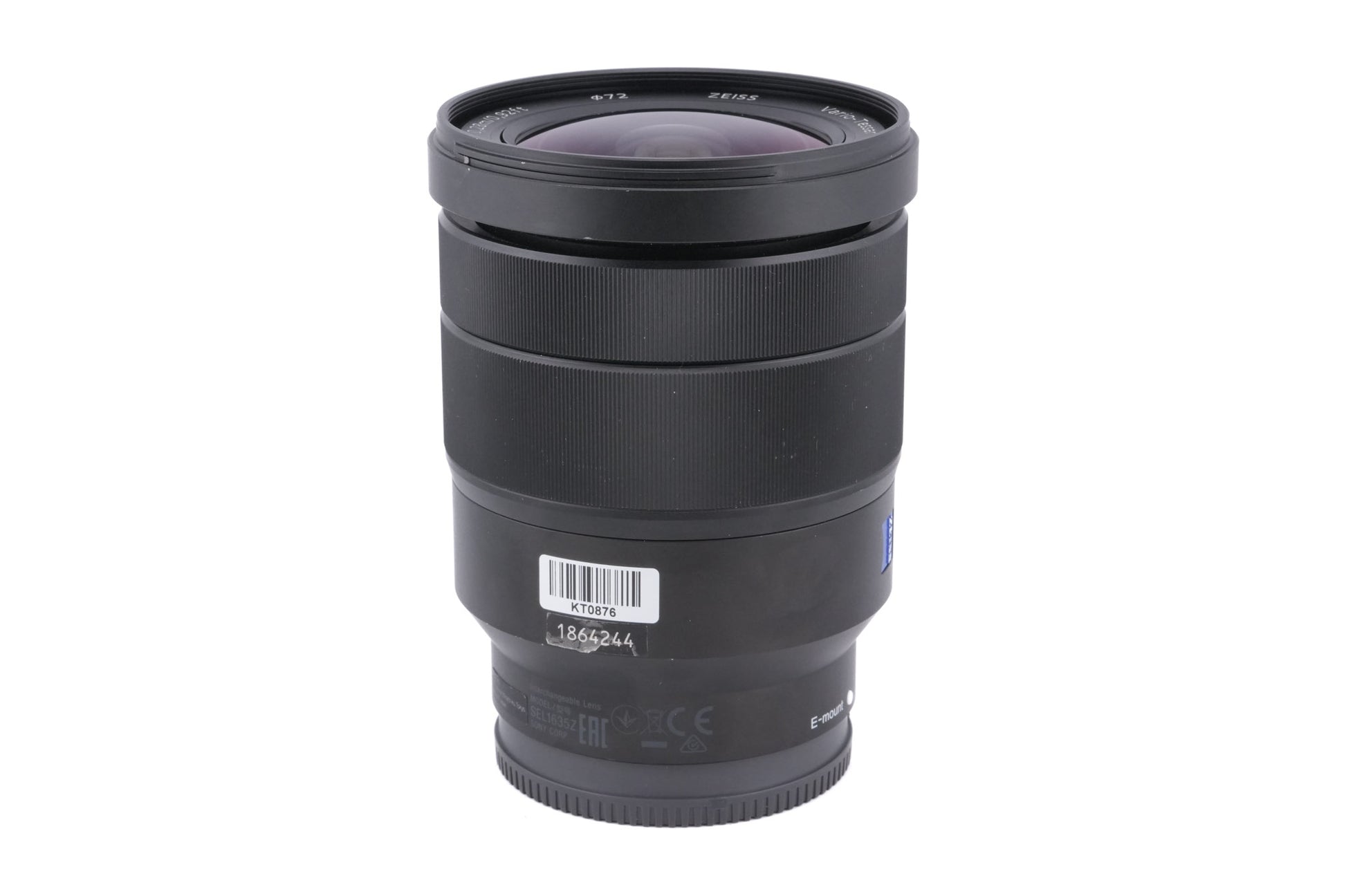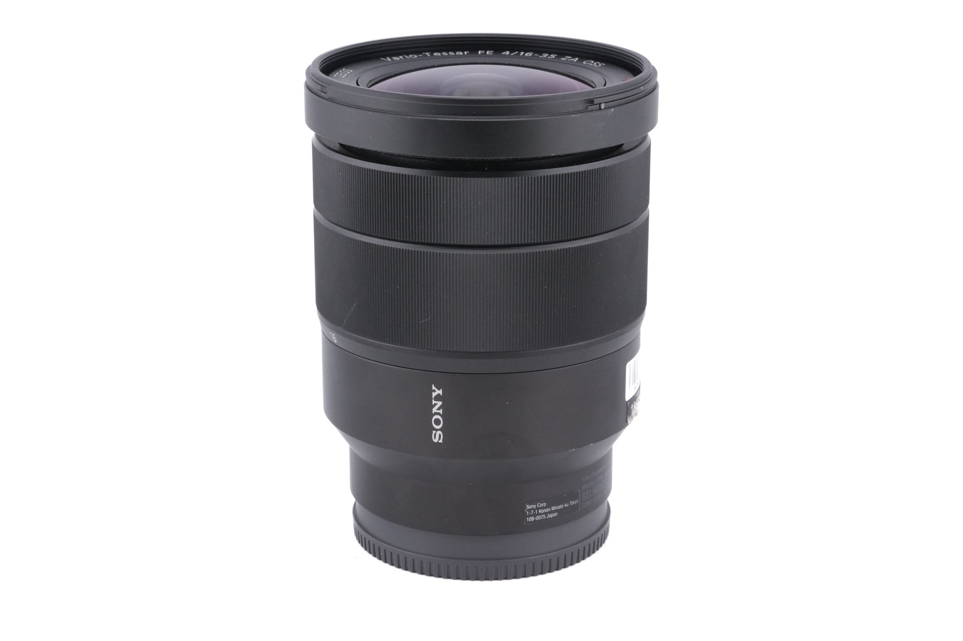 Autofocus wide-angle zoom lens made for FE-mount digital mirrorless cameras by Sony. It has Carl Zeiss T* multi-coatings and optical image stabilization (OSS). The product code is SEL1635Z. Metal body available in black.