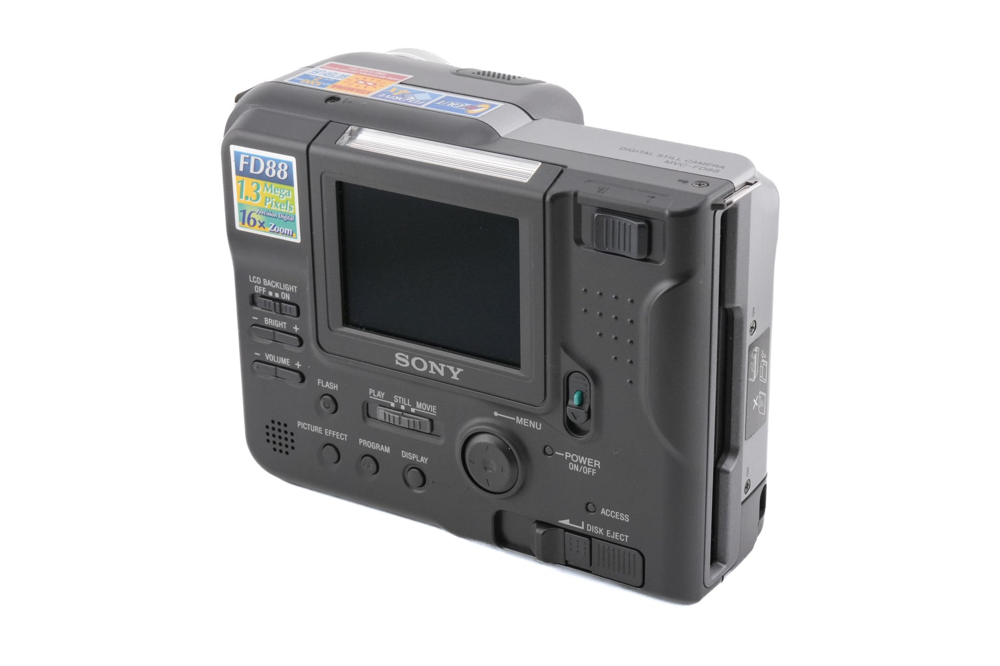 Autofocus digital camera introduced by Sony in 1999. It uses floppy disks as storage. It has a 34 - 400mm equivalent focal length, a 2.5" rear LCD, and a built-in flash. Plastic body available in grey.
