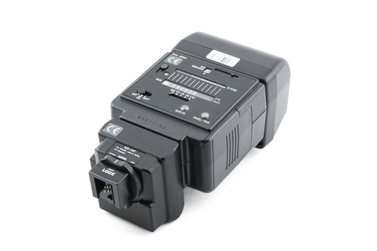Dedicated ringlight flash for 35mm and medium format cameras. TTL capable through changeable hot shoe modules. Fits lenses with maximum filter thread size of 77mm. 4 focus assist lights. Black plastic construction.