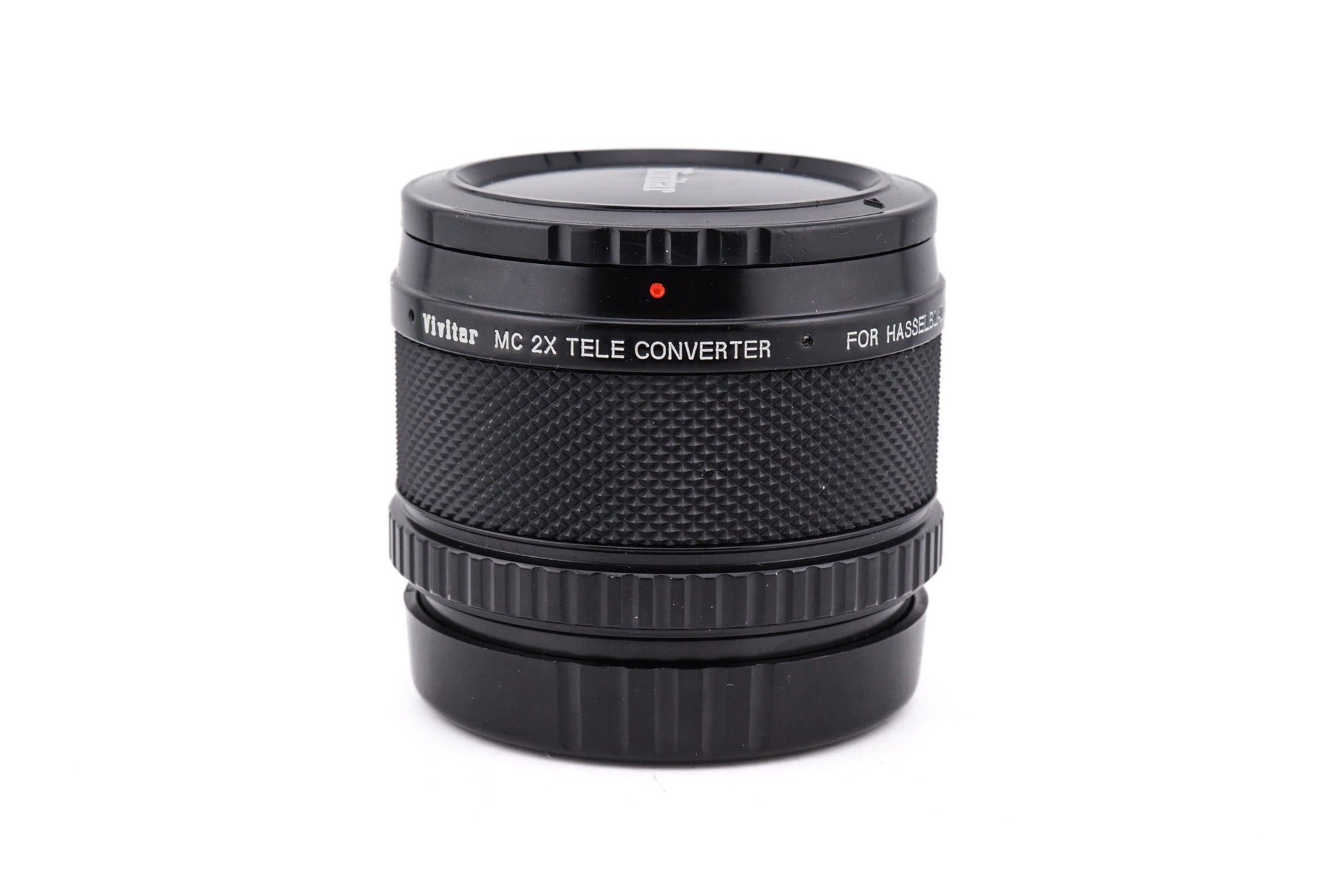 Teleconverter made for Hasselblad V mount 120 SLRs by Vivitar. Doubles the focal length of your lens at the cost of some light transmission. Metal body available in black.