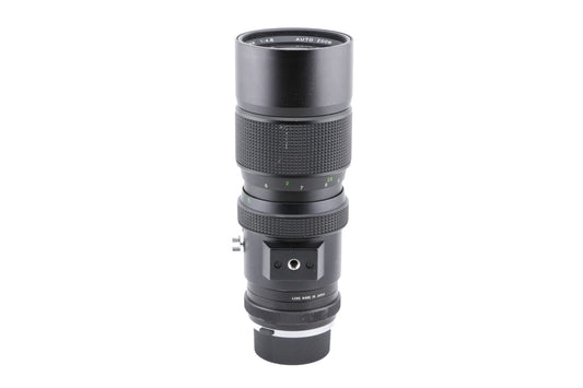 Manual focus telephoto zoom lens made for Olympus OM mount SLRs by Vivitar. It features a built-in tripod collar and a lens hood. Metal body available in black.