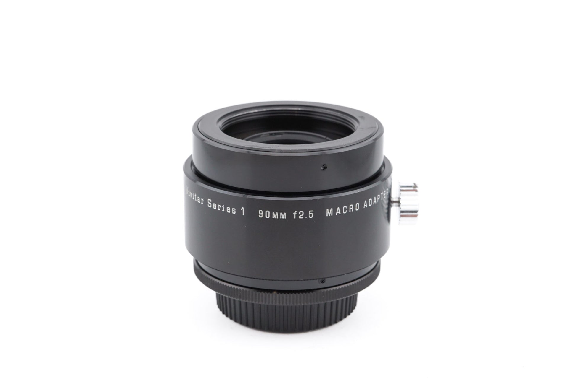 Macro adapter made for the 90mm f2.5 VMC Series 1 lens made by Vivitar. Allows for 1:1 magnification. Metal body in black finish.