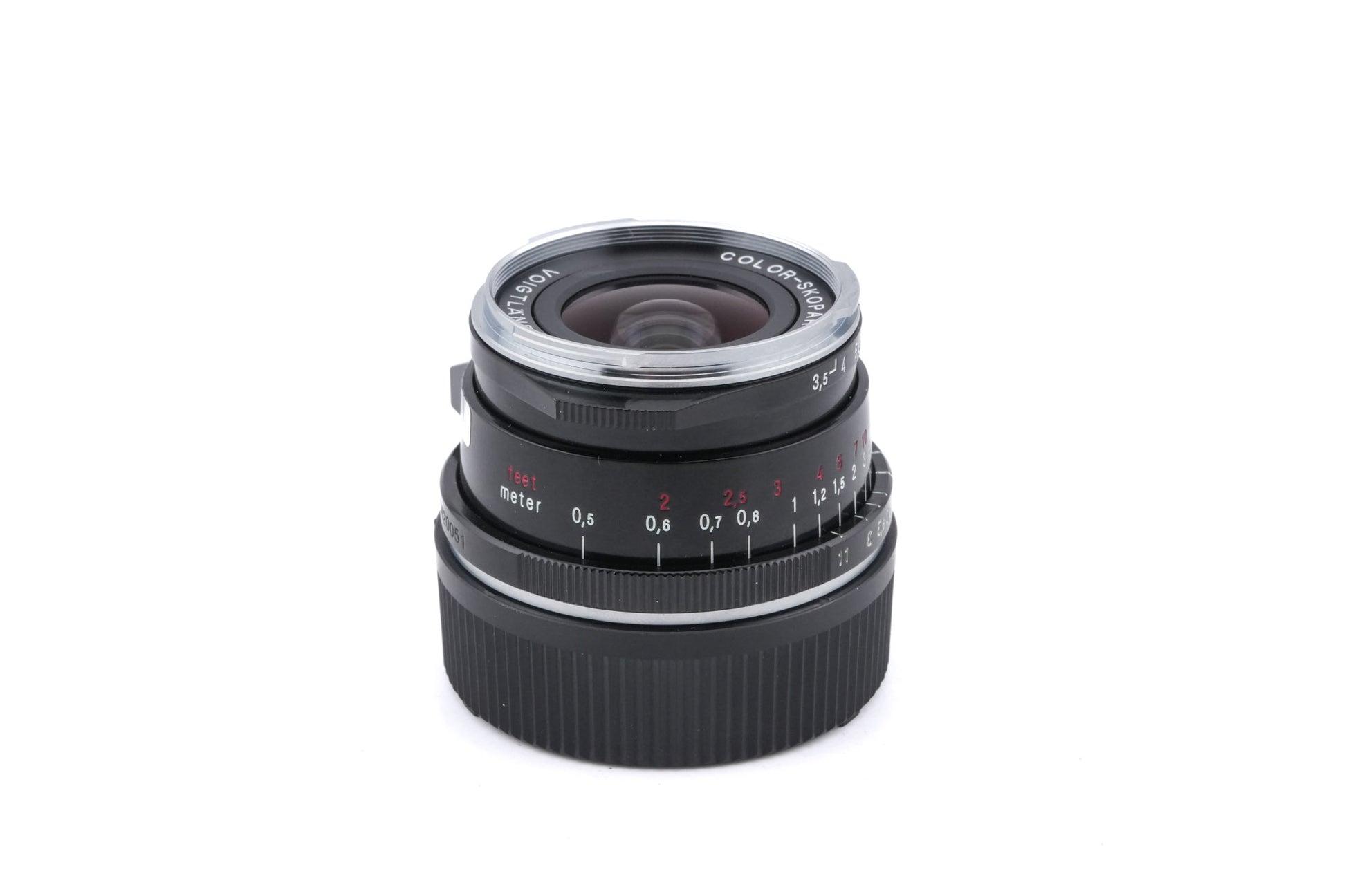 Manual focus wide-angle prime lens made for Leica M mount rangefinder cameras by Voigtländer. Requires an external viewfinder for accurate framing with most cameras. Metal body available in silver & black.