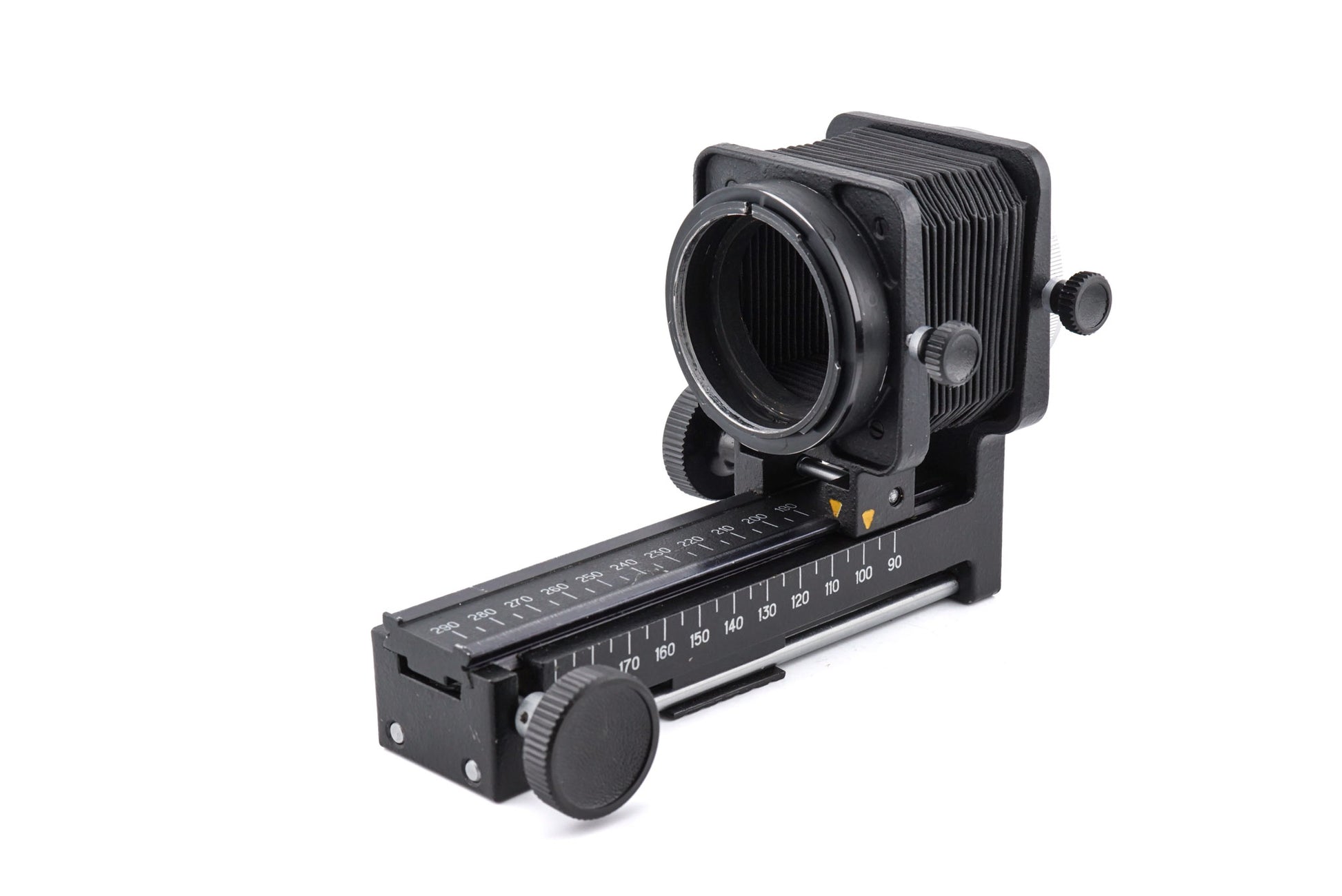 Macro bellows made by Vorsatz in the Soviet Union originally for M42 mount 35mm SLR cameras and lenses. This has been converted to Canon FD-mount. It is used in macro photography to get closer focus and bring the subjects to life-size magnification. Black metal body.