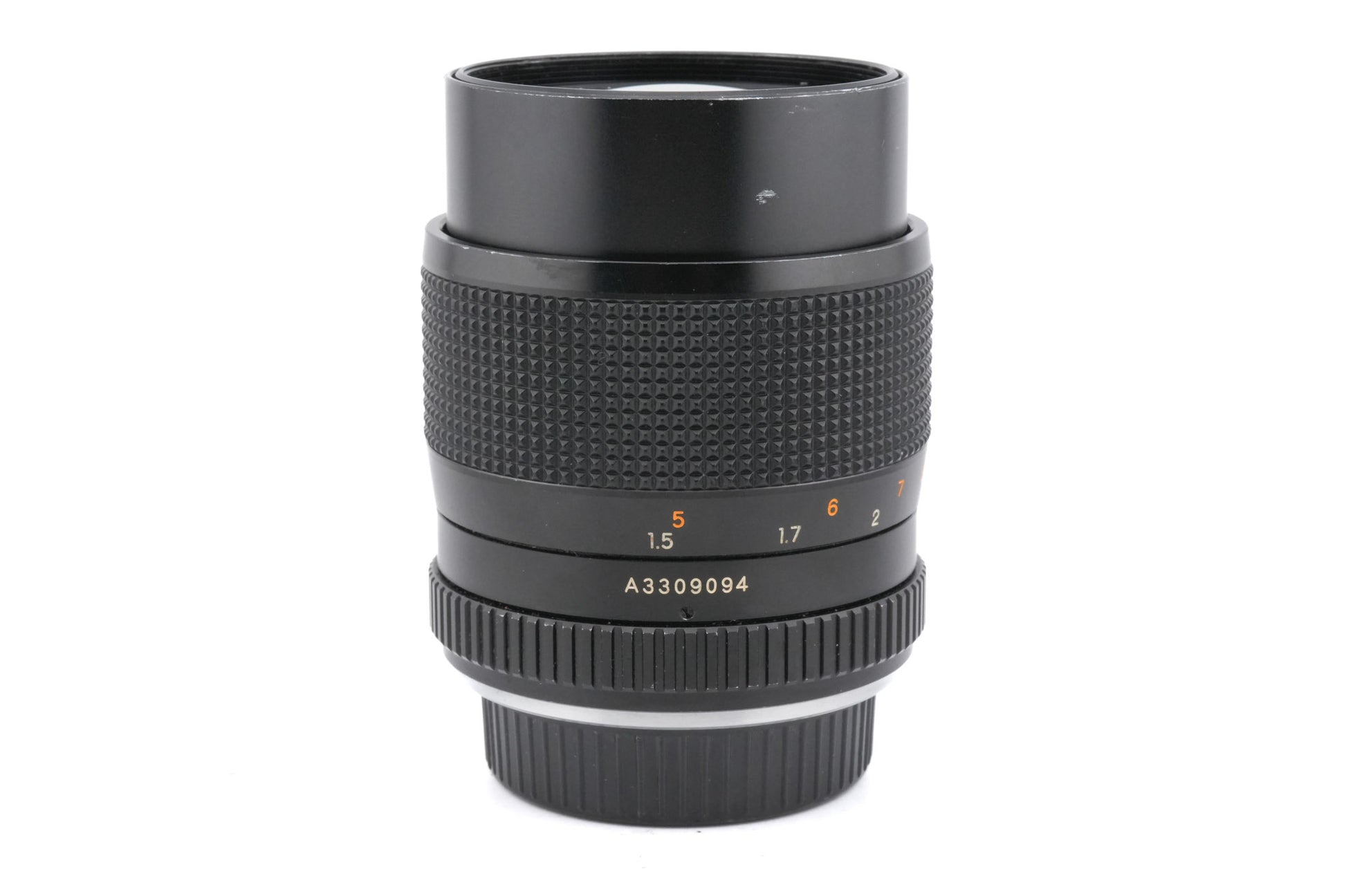 Manual focus telephoto lens made for Contax/Yashica mount 35mm SLR cameras introduced by Yashica. It has a built-in lens hood. Metal body available in black.