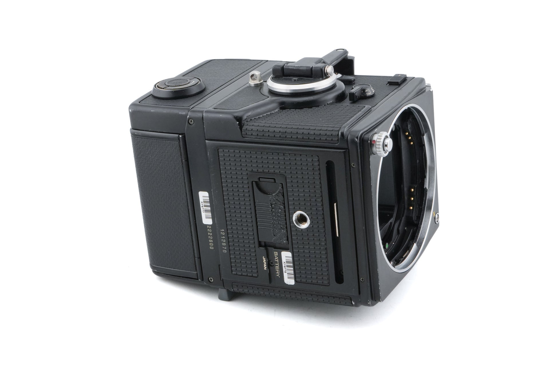 6x6 film back for 120 roll film made for the Bronica SQ cameras by Zenza Bronica. Has an ISO dial with speeds from 25 to 3200 for conveying film speed information to metered prisms. Plastic and metal body available in black.