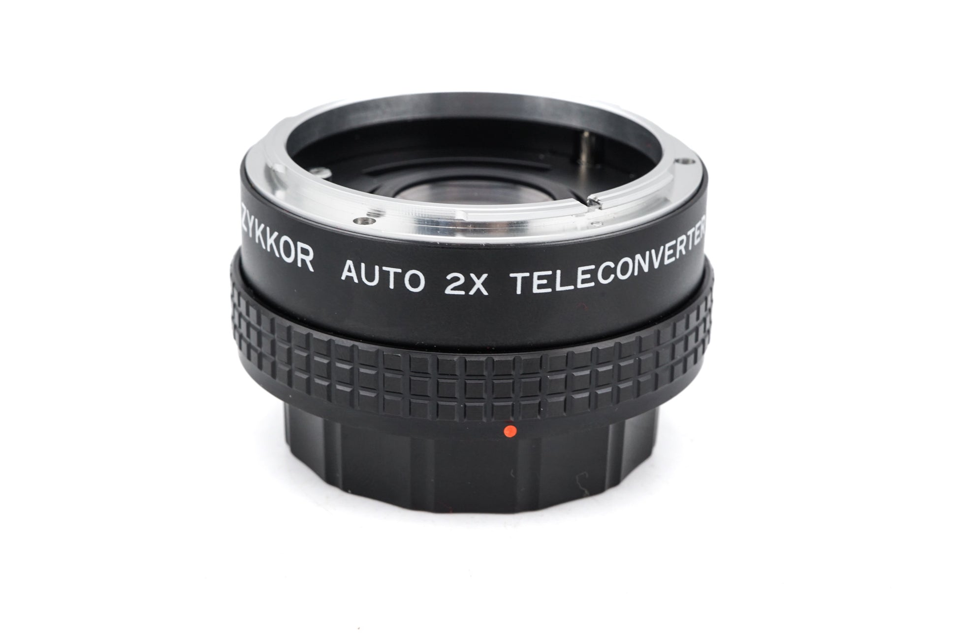 Teleconverter made for Canon FD mount 35mm SLRs by Zykkor. It doubles your focal length at the cost of some (2 EV) light transmission. Metal/plastic body available in black.