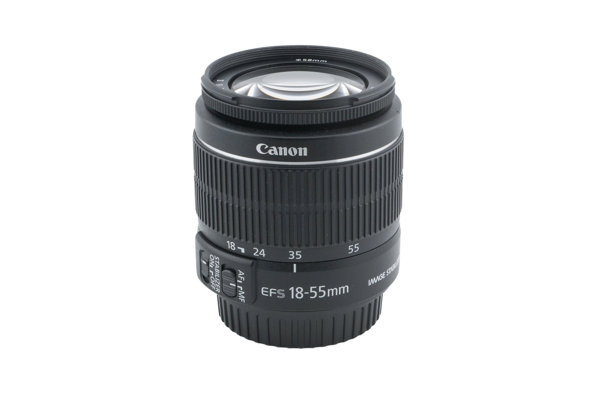 Autofocus zoom lens made for EF-S mount digital SLRs by Canon. It gives the equivalent field of view to a 27-82.5mm lens on full frame/35mm. This is the second EF-S kit lens that has image stabilization (IS). Plastic body available in black.