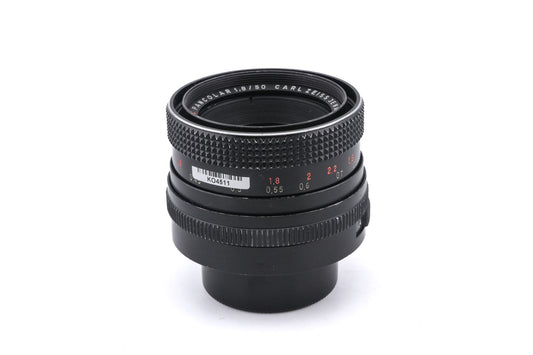 Manual focus normal lens made for 42-screw mount SLR cameras by Carl Zeiss. Metal body available in black.