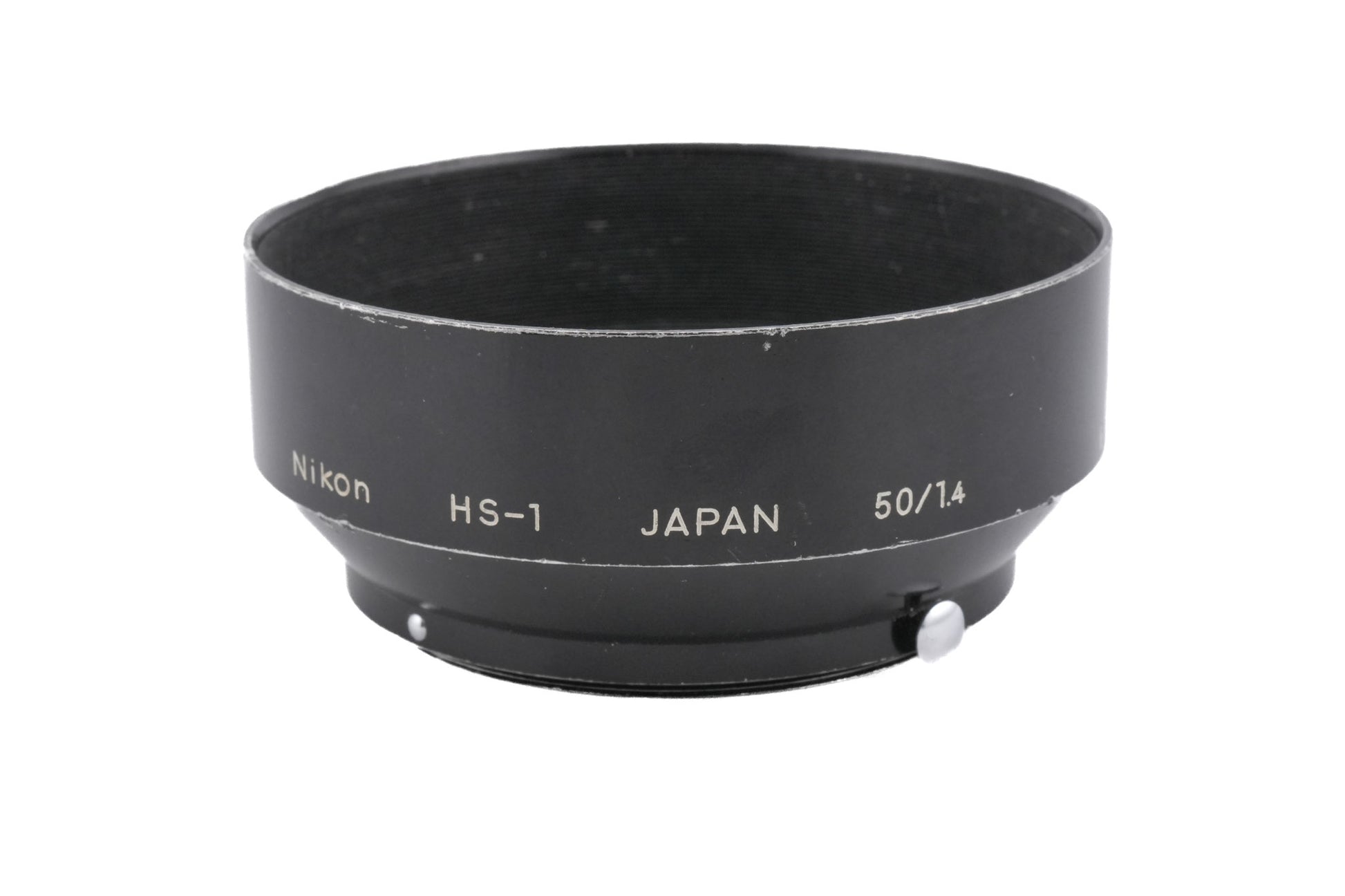 Lens hood made by Nikon for 50mm f1.4 Nikkor lens. Blocks light from entering the lens at odd angles, preventing ghosting and flaring. Black metal body.