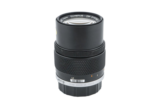 Manual focus telephoto lens made for OM-mount SLR cameras by Olympus. Has a built-in lens hood. Metal body available in black.