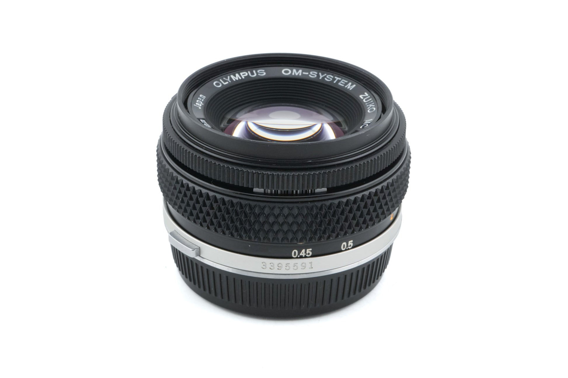 Manual focus normal lens made for OM-mount 35mm SLR cameras introduced by Olympus. It has its own aperture stop-down button and multi-coating. Metal body available in black.