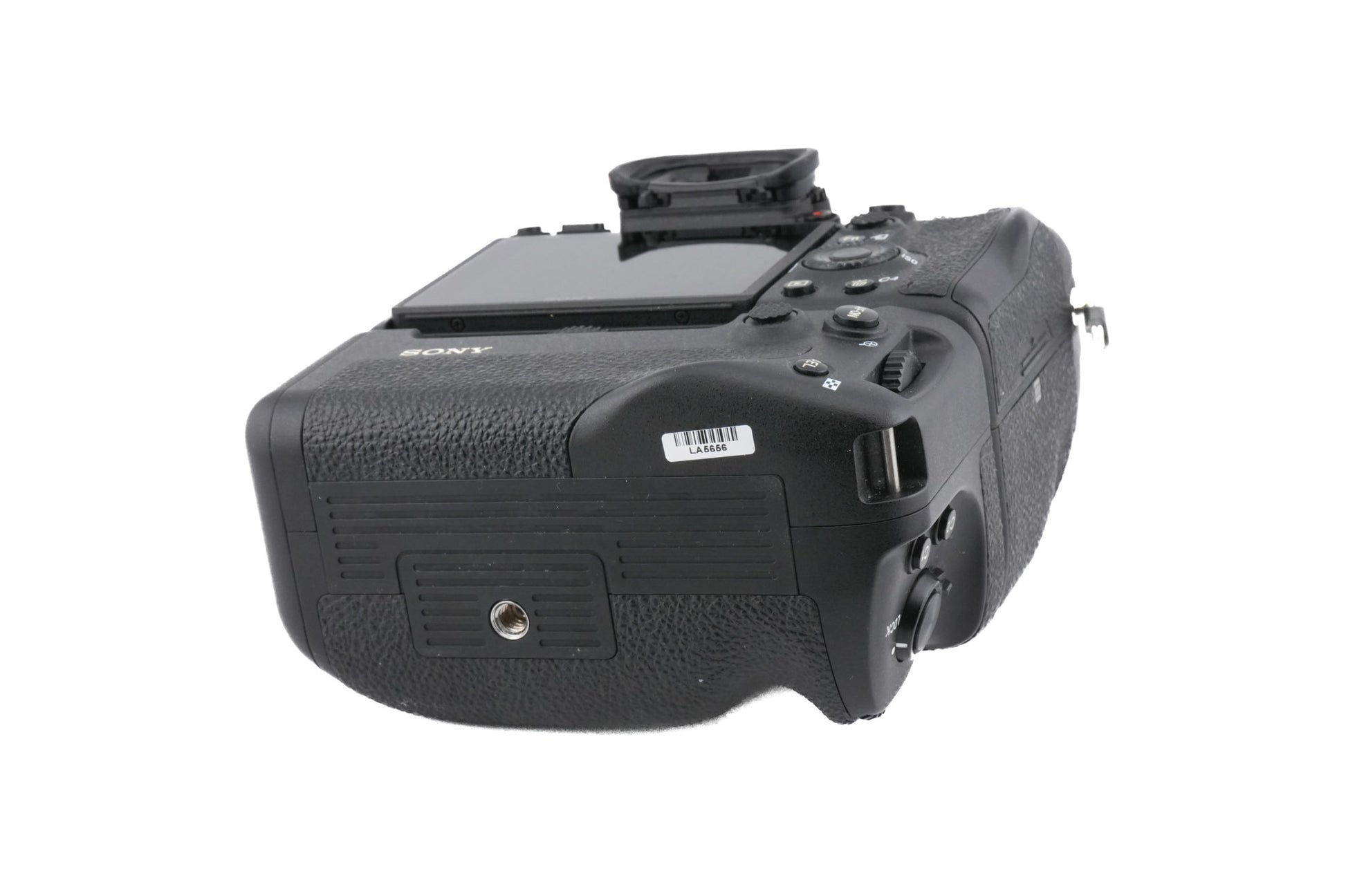 Accessory battery grip for Sony Alpha 1, a7 IV, a7R IV, a7S III, and a9 II mirrorless cameras made by Sony. Provides prolonged battery life and added comfort for vertical shooting. Features include rear buttons, two control dials, and a shutter button. Plastic body available in black.