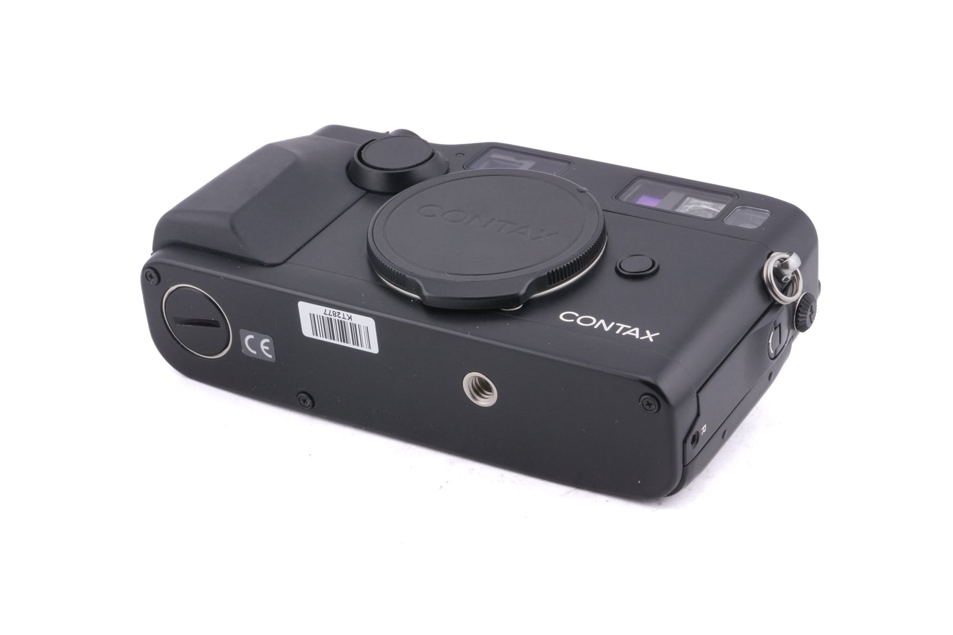 Autofocus G-mount 35mm hybrid rangefinder camera released by Contax in 1996. It uses a rangefinder-style passive autofocus system for general focusing like the G1, but added an active system to improve precise focus accuracy. It has +/- 2 EVs of exposure compensation and a dial for manual focus control. Titanium body available in black.