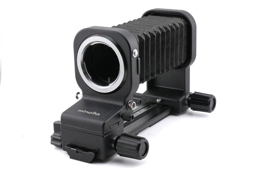 Macro bellows made for Minolta MD mount SLRs. Metal body available in black.