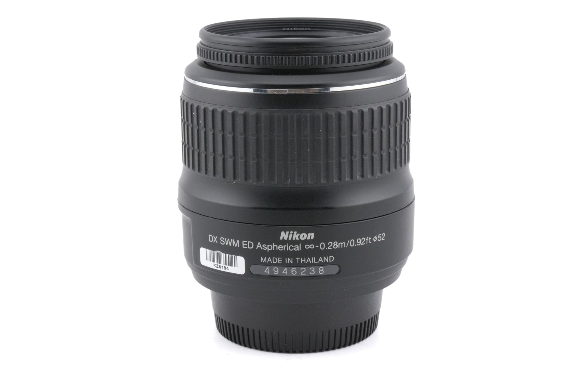 Autofocus standard zoom lens made for DX-mount digital SLRs by Nikon. It is designed for APS-C-sized sensors and gives the equivalent field of view to a 27-82.5mm lens on full frame/35mm. This is the kit lens for many early Nikon DX-mount cameras. Plastic body available in black.