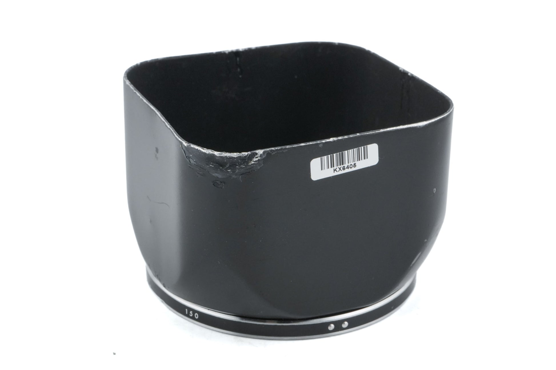 Lens shade/hood made for the Hasselblad V system lenses introduced by Hasselblad in Ca. 1962. It is designed to be used with 100mm, 120mm, 150mm, and 250mm Hasselblad C & C T* V lenses. Originally marked "150" and later changed to "100-250". Older models are marked 150 and made of aluminum and later ones are marked 100-250 and are made of plastic.