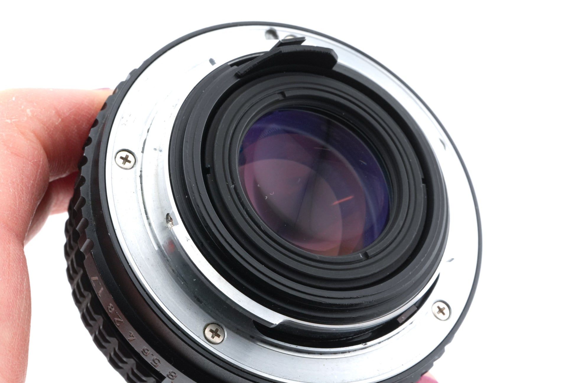Manual focus normal lens made for K-mount 35mm SLR cameras by Pentax. It does not work with the automatic modes of later Pentax models. Plastic/metal body available in black.