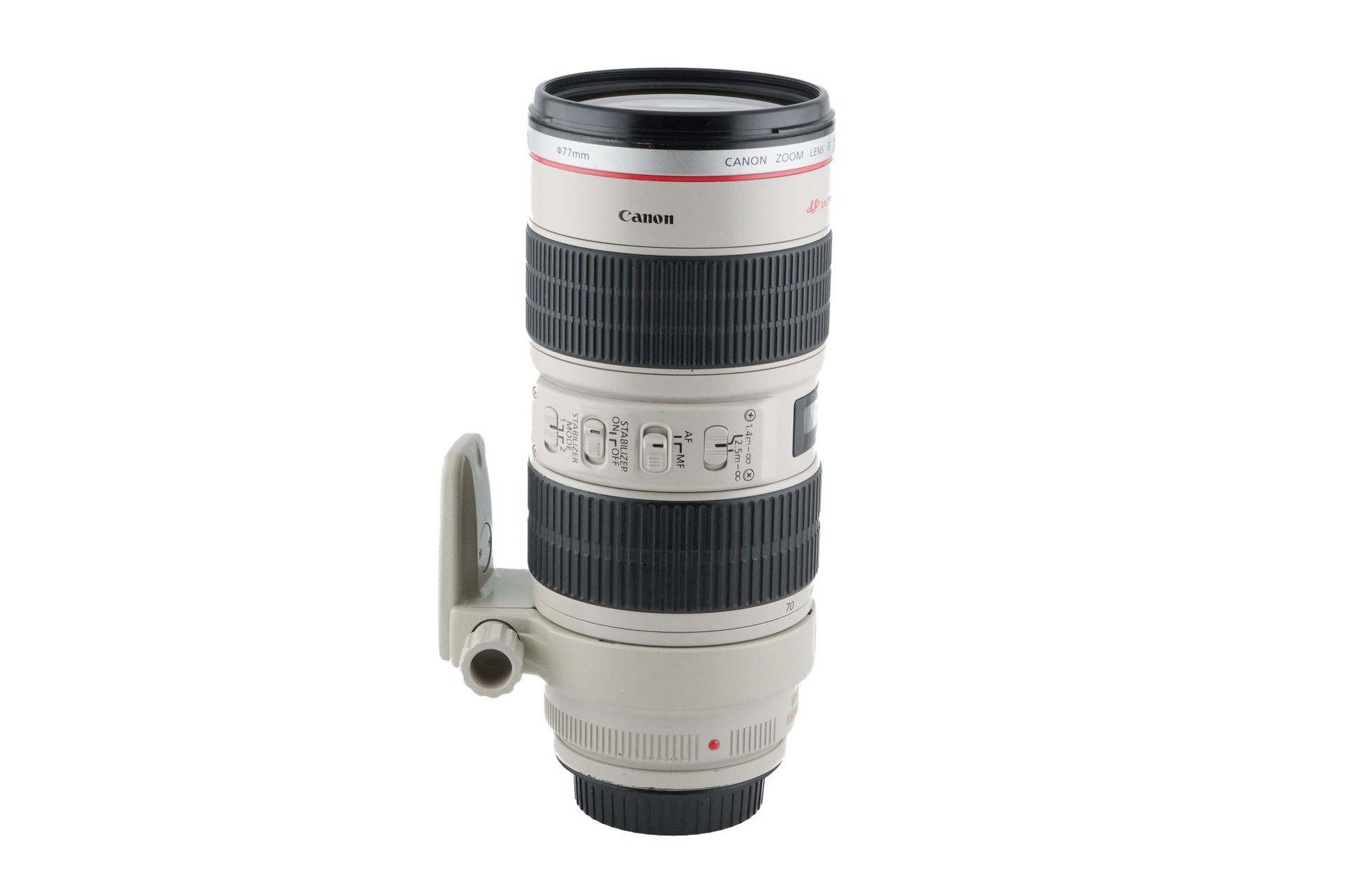Autofocus telephoto zoom lens made for EF-mount SLR cameras by Canon. It's part of Canon's L-series of professional lenses and has light weather sealing. It also has image stabilization (IS) and an ultrasonic focusing motor (USM) for autofocus. Plastic/metal body available in white.