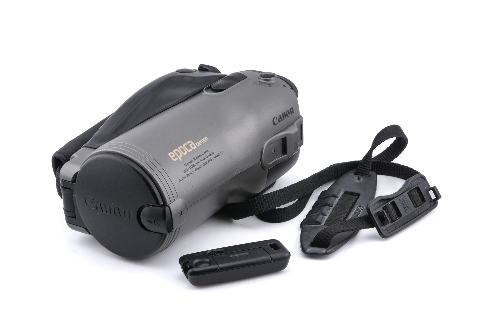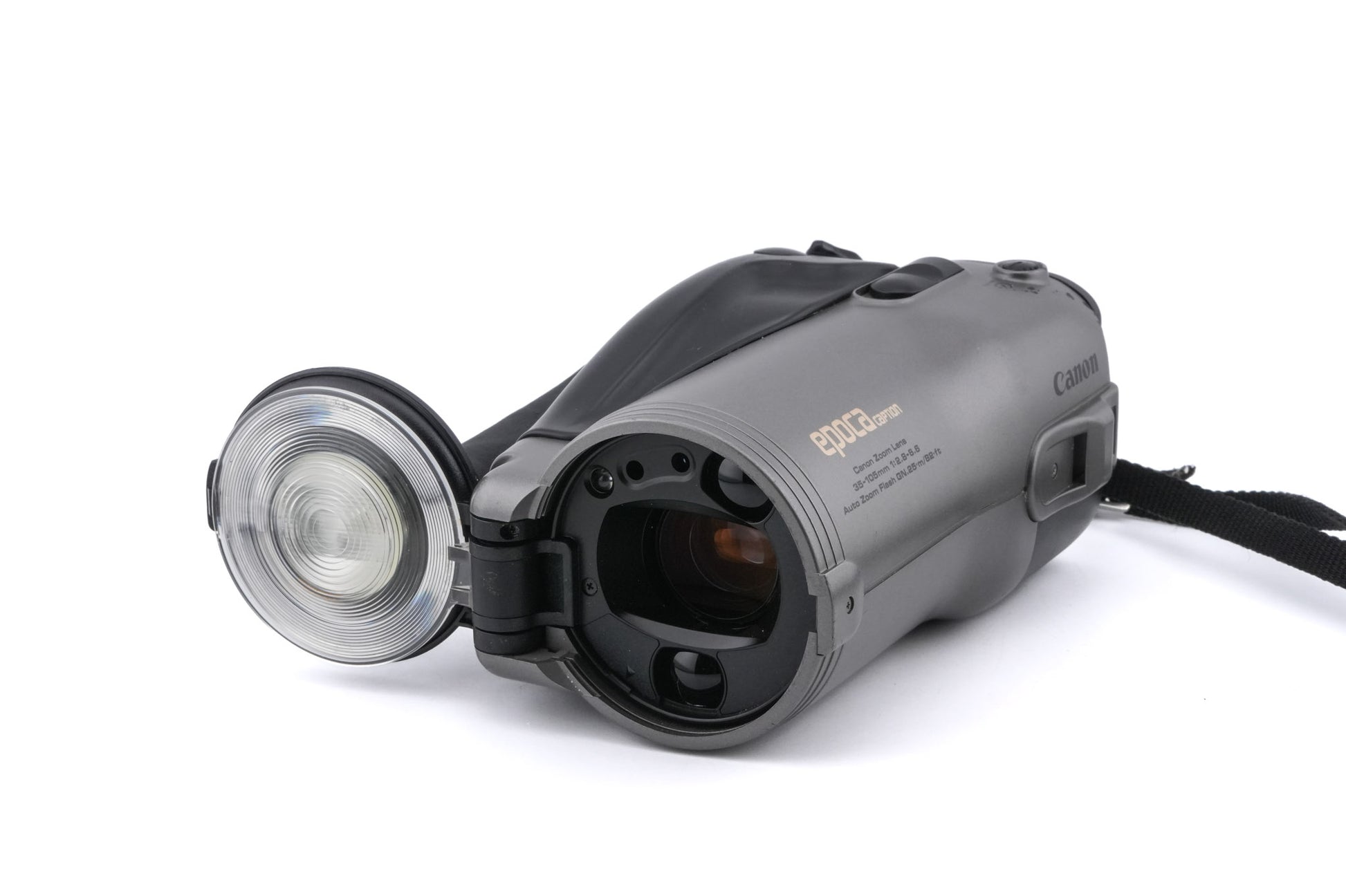 Autofocus 35mm point-and-shoot camera released by Canon in 1990. Camcorder-esque design with built-in zooming flash in the lens cover. Known as Photura in North America. Plastic body available in gray & black.