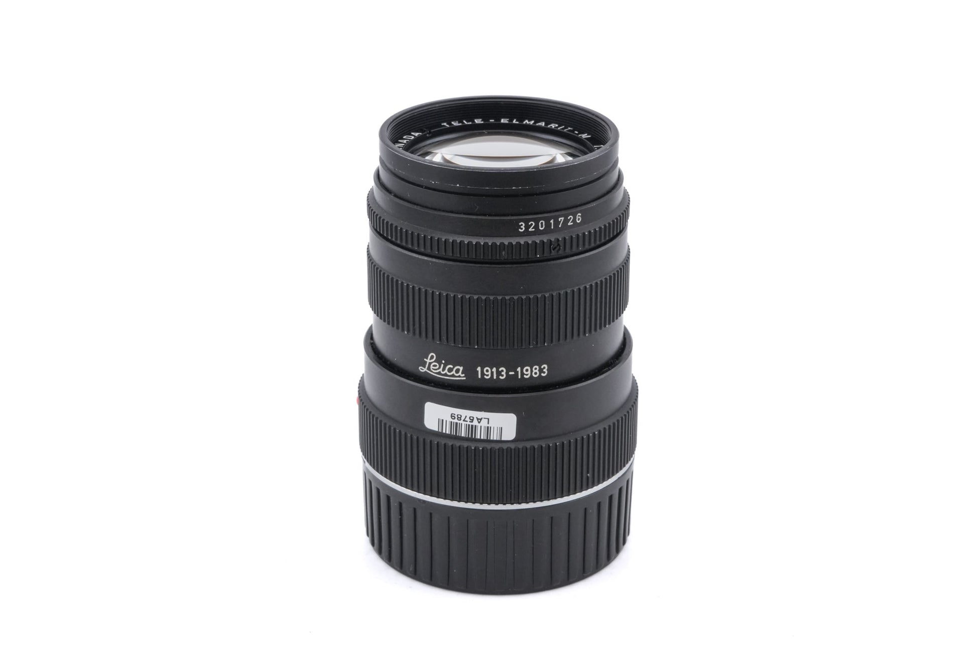 Manual focus telephoto lens made for M-mount rangefinder cameras, initially introduced by Leica in 1973. This is an improved version of the earlier 90mm f2.8 Tele-Elmarit from 1964. The optical formula changed from a 5 to a 4-element design. The overall design of the lens had also changed, now with a slimmer profile and a fine knurled focusing ring. The lens was introduced at the same time as the 135mm focal length was discontinued, and was therefore developed with a 1.5x extender in mind to provide a compact 135mm lens. It is sometimes referred to as the "Thin" Tele-Elmarit. NOTE: It uses the same code as the earlier version. This lens is a commemorative version introduced in 1983, together with a matching special Leica M4-P camera. It commemorates the 70th anniversary of Oskar Barnack's original prototype - the Ur Leica. It was produced in a small batch of only 200 lenses. Metal body available in black (11800).