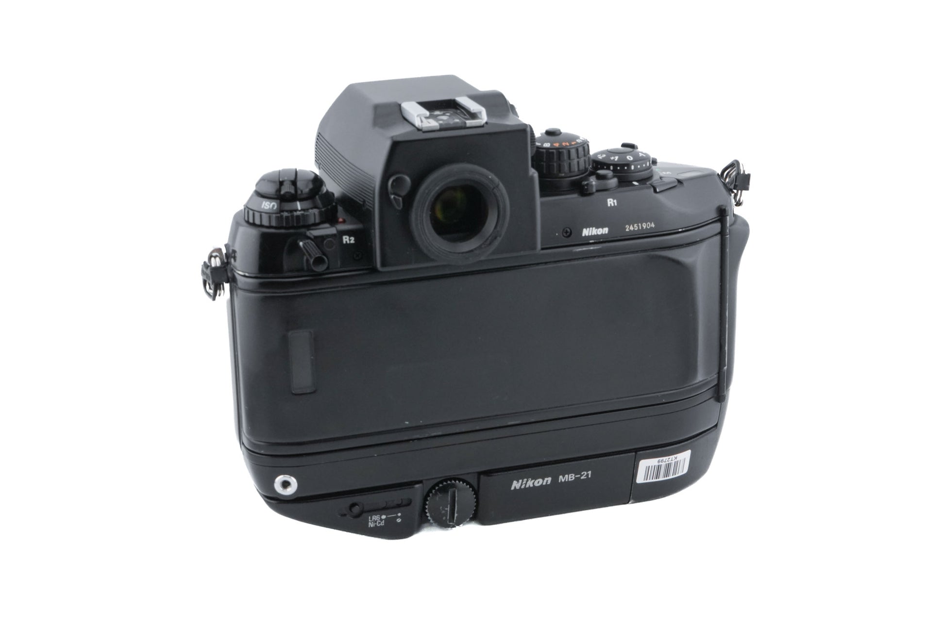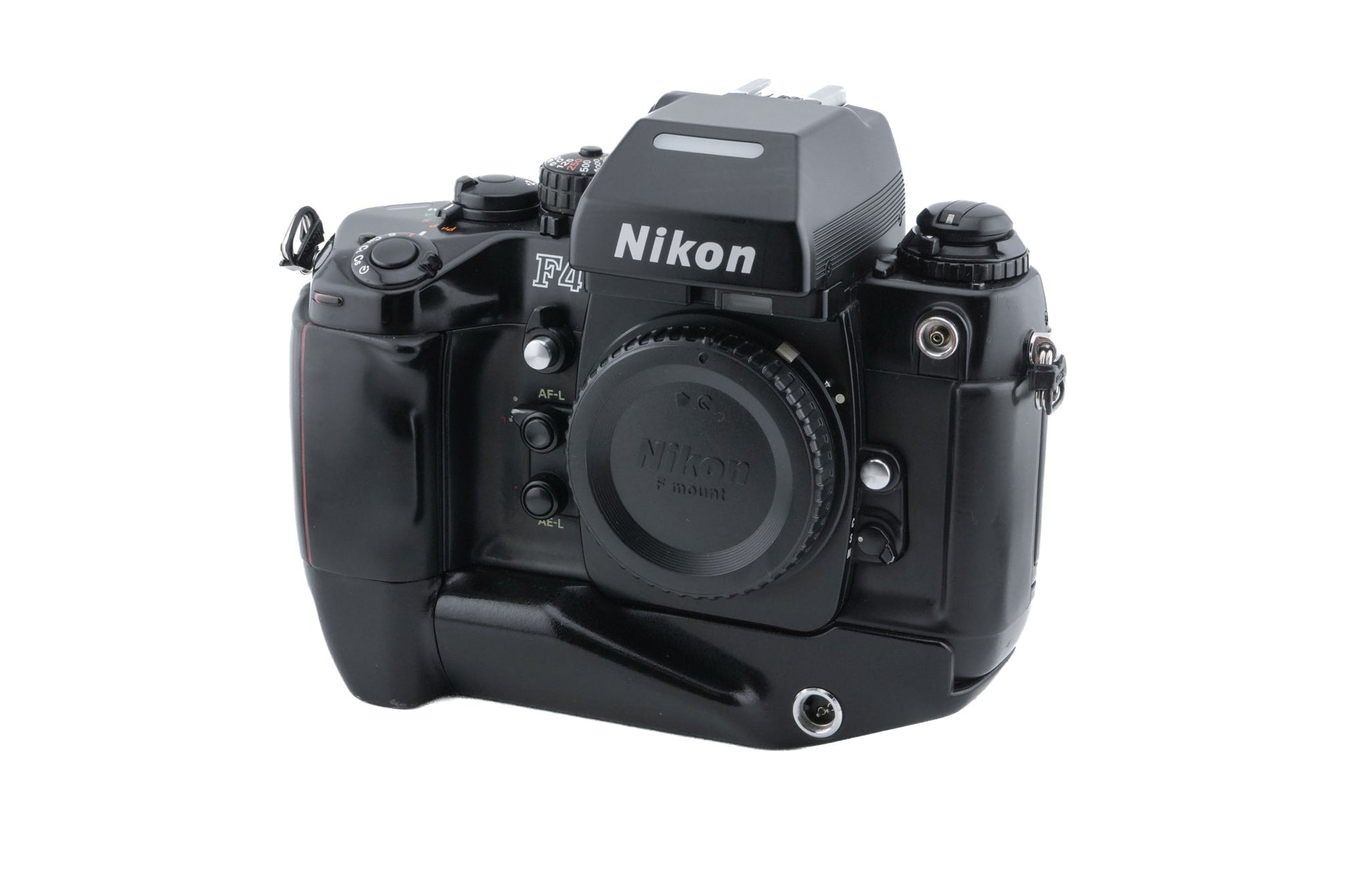 Autofocus F-mount 35mm SLR released by Nikon in 1988. The F4s is a standard F4 body with the MB-21 battery grip. Like other professional F cameras, the F4 has a wide variety of finders, focusing screens, film backs, grips, and other accessories. Metal and plastic body available in black with a red accent.